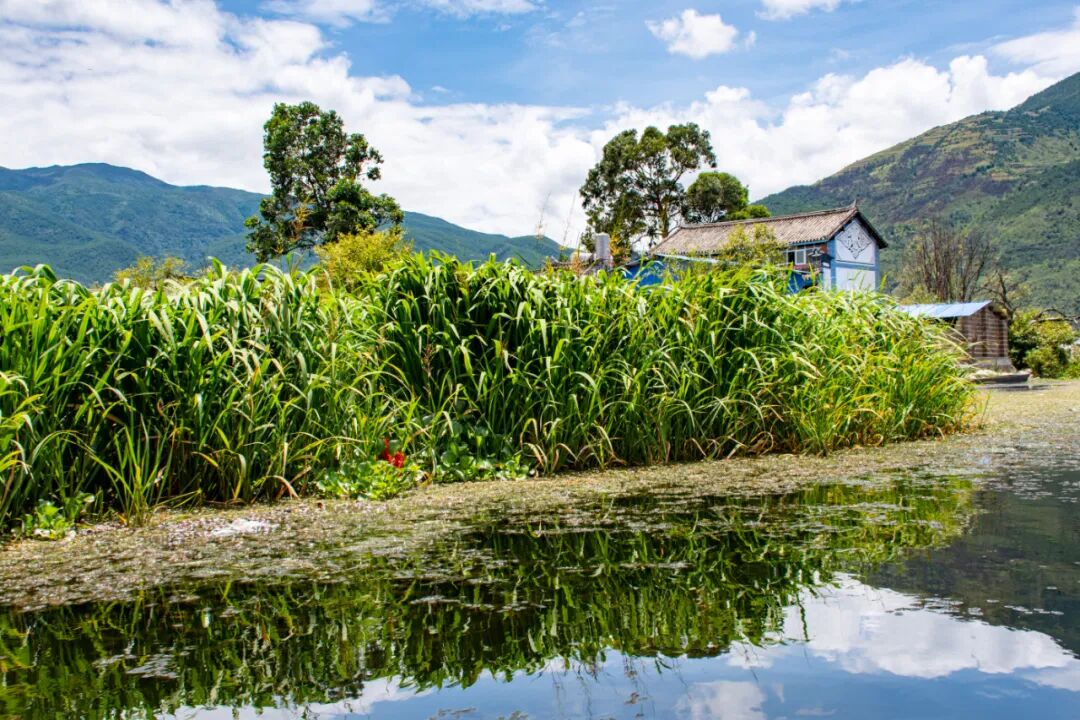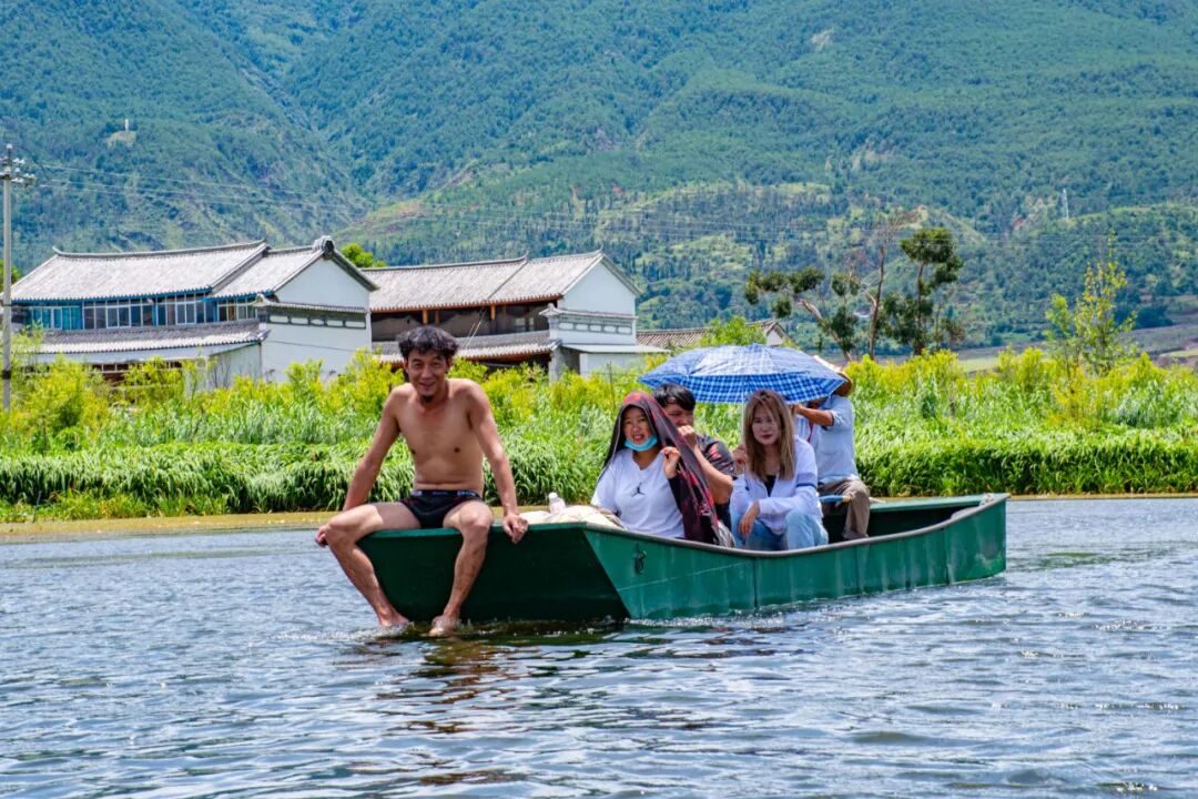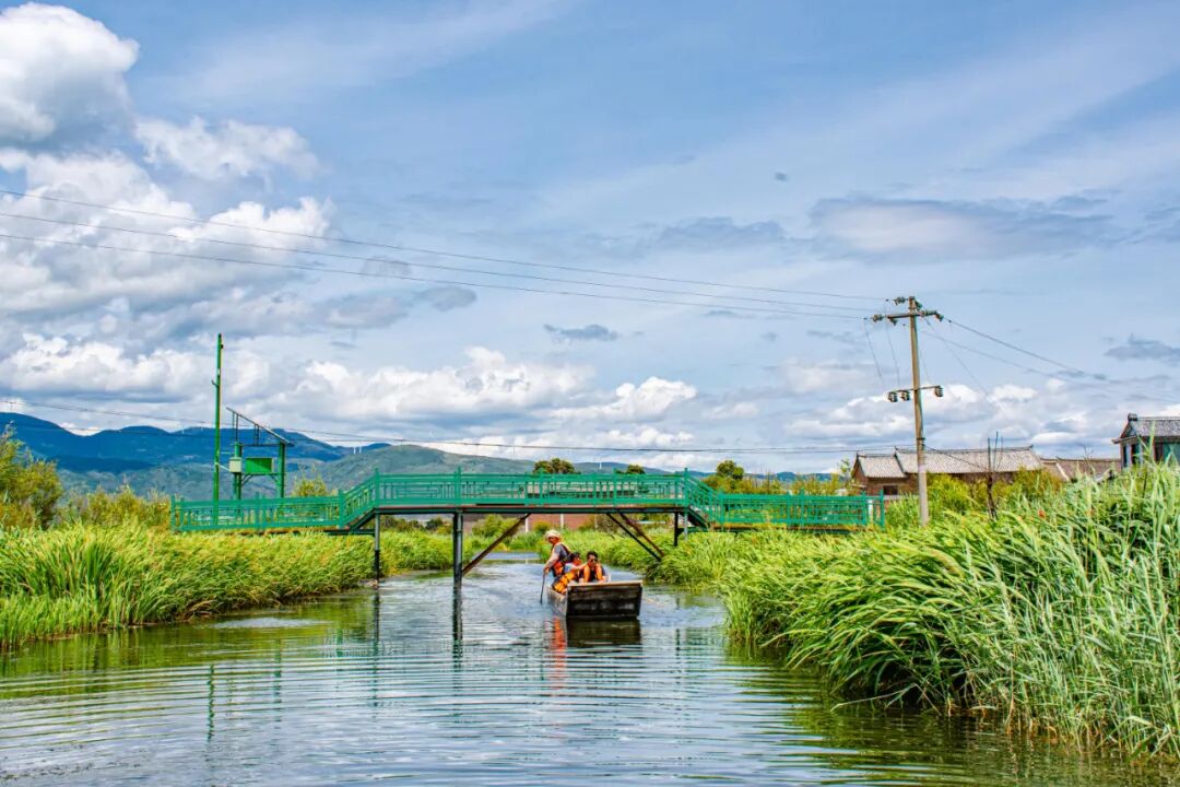 乘船出发一气呵成,由狭窄的河道驶向草甸深处,宽阔的草甸深处被芦苇荡掩映的是白族民居,更远处是高高耸立的山峰。