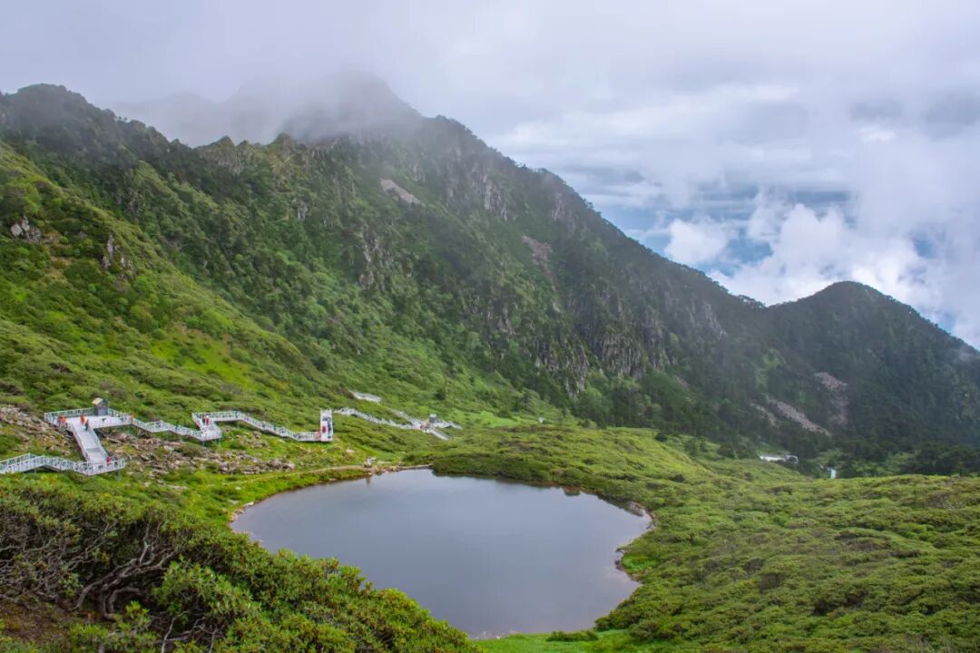 位于山巅的洗马潭是苍山洗马潭大索道一线唯一的“水色”,它在陡峭的青翠山峦里,在杜鹃花丛里显得很特别。