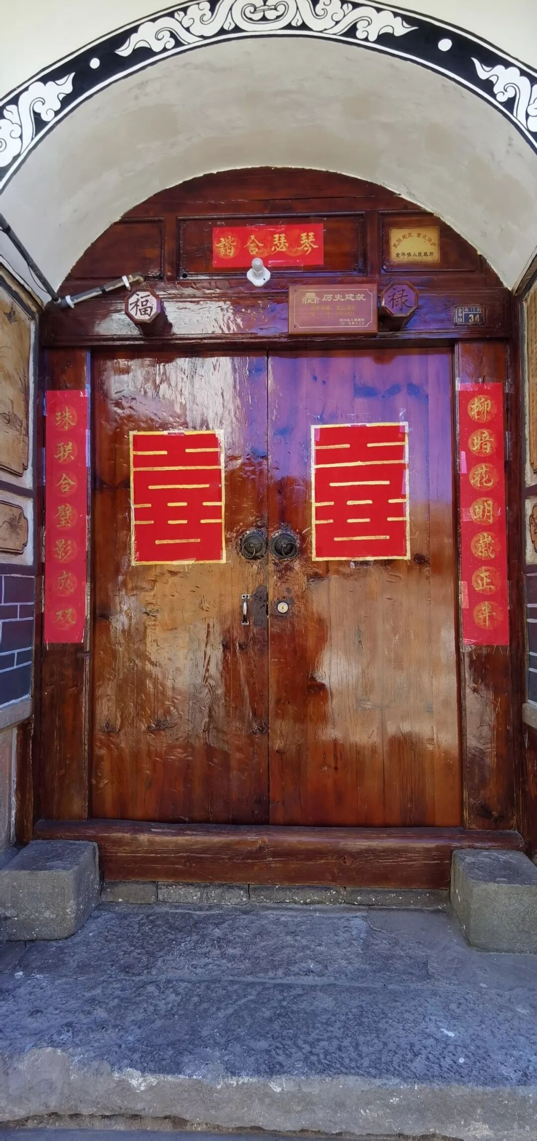 除了大家熟知的木雕、黑陶,自撰自书的剑川楹联堪比徽州。从楹联的颜色(红、绿、黄、白联)就可知晓这户人家中正在经历着怎样的喜乐或哀伤之事。而从楹联的内容便可了解这个家族的精神追求与境界。从伽蓝桥向西门走去,驻足于家家户户的门前,大家读懂了剑川人的安静与祥和,所谓知足的人生,不过是守我心内三分地,任他门外十分春。