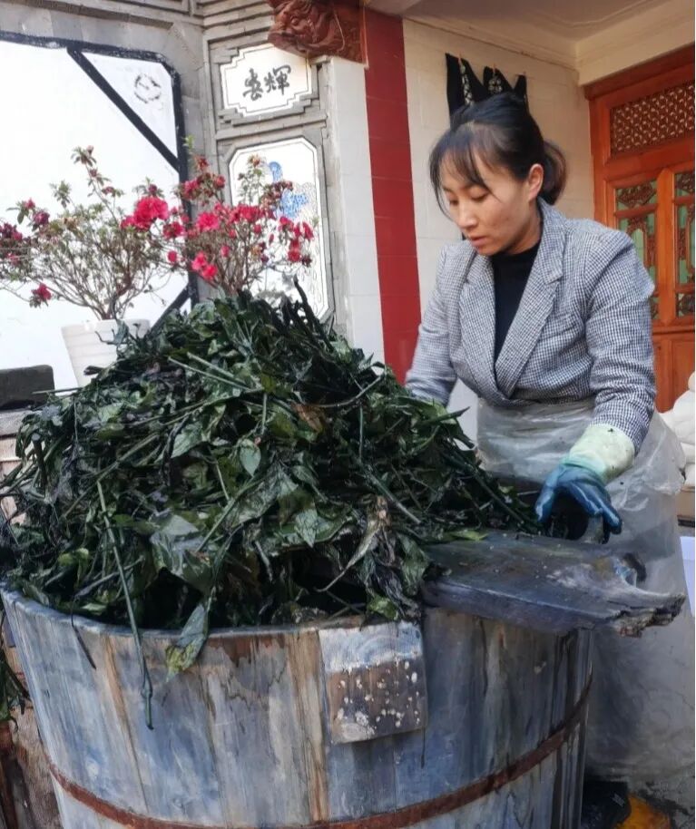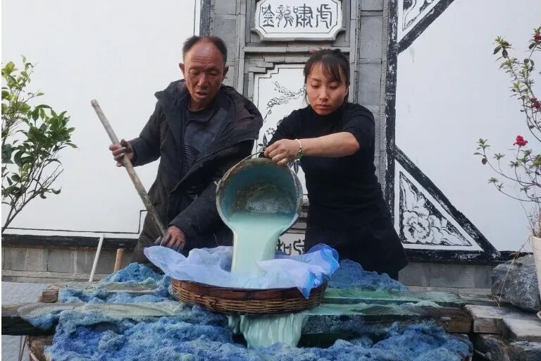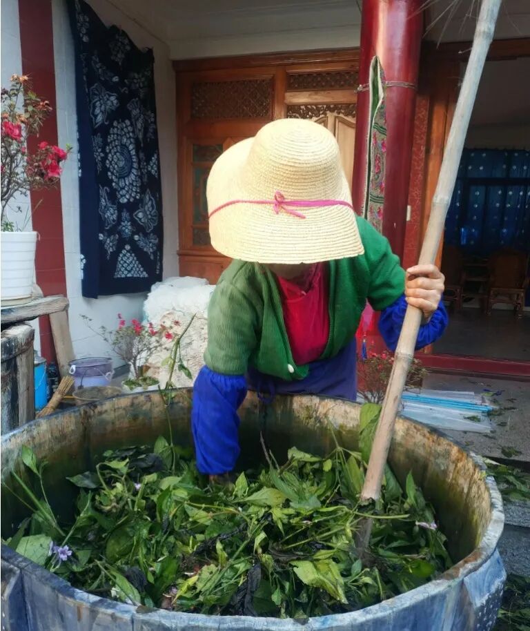 苍山洱海是白族生活的本源,白族扎染中飘溢着的蓝与白,正是从板蓝根这一药用植物中“打蓝”出来的。张翔和家人将种植在苍山脚下的板蓝根收割回家,在冷水里浸泡半个月后,将渣滓捞出,按比例拌入石灰,每天都要用工具不断敲打,发酵半年以上,水分蒸发,染泥制成。