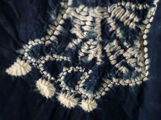 扎花完成后,就需要以花形为中心进行反复浸染,根据所需要的颜色不同,浸染的次数也不同。经过晾晒、拆线后,一副副美丽的图案便呈现在人们眼前。因为扎花的手艺和浸染的次数不同,就算印版相同,最终呈现的图案也会有所差异,所以每一块扎染布都是独一无二的。