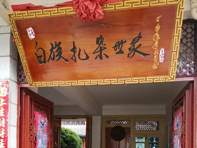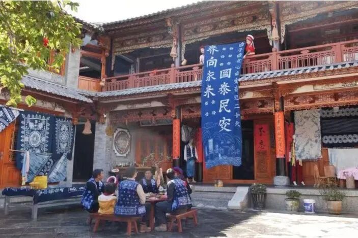 苍山脚下、洱海之畔的周城,一座座青瓦白墙的民居错落有致,一块块蓝白相间的染布随风轻舞,汩汩的泉水顺着七拐八弯的巷道流淌,“风带走了沙,雨带来了花,白族的姑娘把扎染带回了家”的歌声在巷道回荡。走进代表性传承人张翔的家,正门上方悬着“张仕绅故居”的木匾,后门同样有一块木匾,上书“白族扎染世家”,传习所内摆满了扎染工具和扎染作品。