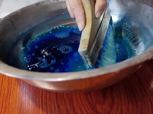 蓝靛泥每染一次颜色都会变化,根据颜色的要求,有时候要染到二十次,而且只能晾干。“爷爷经常和我们强调,千万不要把板蓝根染色丢掉,直到现在我们也还在坚守。”用板蓝根染色的慢节奏,张翔和她的家庭坚持了十代人。
