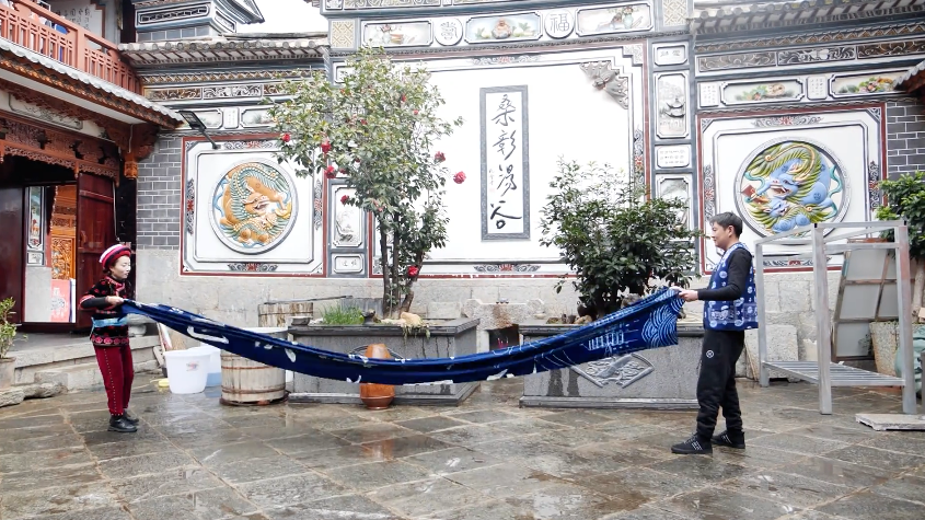 一瓦一屋一人家,一针一线一素布,每个出太阳的日子,扎染好的布料都会在白族院落里迎风飘扬,穿过蓝白的扎染布海,透过千年时光,蓝与白已浸染成为白族人民生活的底色。