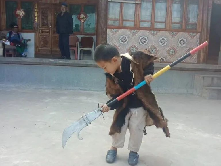 “大刀舞对舞者的体力和灵巧度要求较高,学习大刀舞,一定要先会打歌,结合彝族打歌的步伐,才能耍出刀路。” 在平日的打歌场上,闭学军主要是舞大刀。他的小孙子三岁多就开始跟着闭学军学舞大刀,一招一式,有模有样。