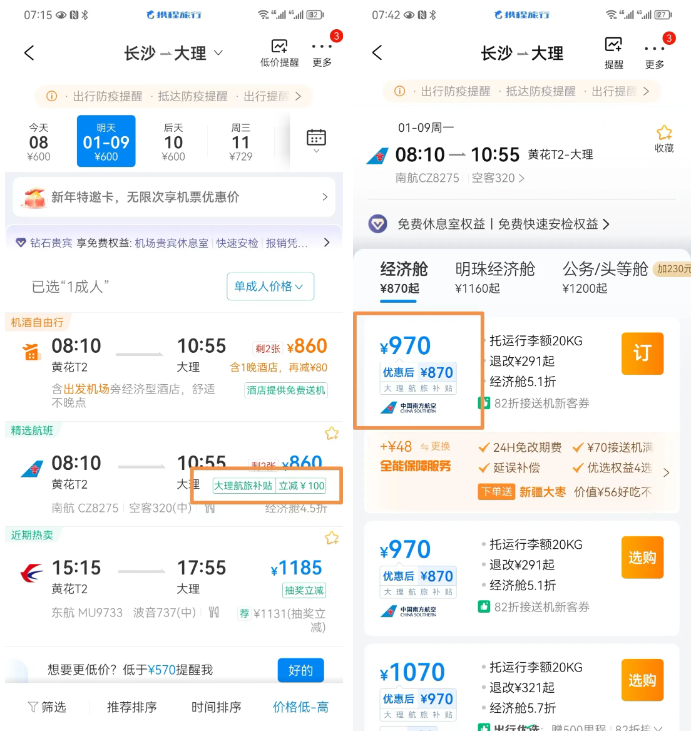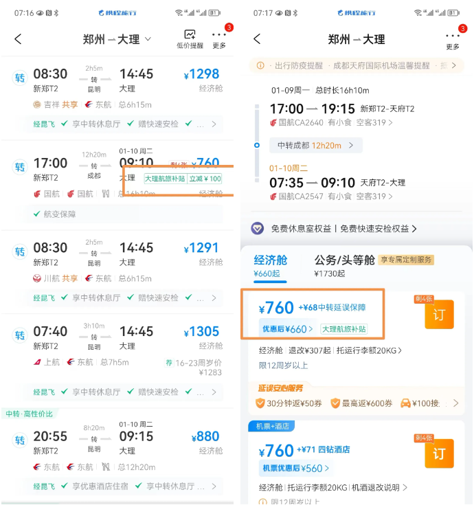 中转到大理机票订立减打开携程旅行APP的“机票”频道,搜索目的地为大理的中转航线,即可看到“大理航旅补贴”优惠标签,首期面向天津、沈阳、郑州、济南、合肥、厦门、福州、兰州、拉萨、海口、青岛、无锡、宁波、太原、温州、三亚、泉州等17个城市投放,直接下单可享立减100元的补贴优惠。