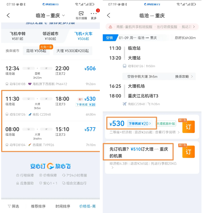 空铁联运高铁票减免:打开携程旅行APP的“机票”频道,搜索云南临沧、云县、巍山、保山、永平、漾濞、祥云、楚雄、南华、鹤庆、丽江等11个站点的进出港行程,点击“查询”进入产品列表页,选择“火车+飞机”中转产品,选购带有“大理航旅补贴”优惠标签产品,下单即享高铁票价二等座票价全额减免,最高可减免101元。同时,空铁联运高铁减免与机票订立减补贴叠加享受,最高可享201元补贴。
