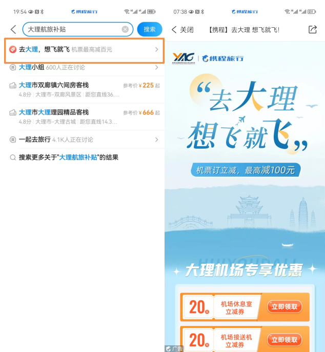 进入携程旅行APP,在首页搜索栏输入“大理航旅补贴”或“大理航旅消费补贴”关键词,进入大理航旅惠民补贴专题页面“去大理 想飞就飞”。
