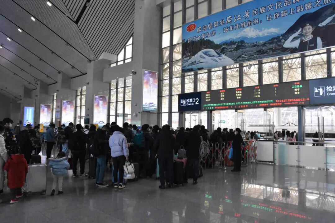 今年春运从1月7日开始,持续至2月15日结束,为期40天。丽江火车站工程师马剑崑介绍:“今年春运丽江站预计发送旅客25万人,日均客发6000人左右,日均到达6500人左右,预计同比增长30%。从目前的情况来看,预计节前节后客流量较大,务工流、探亲流叠加,客流高峰较为突出。”