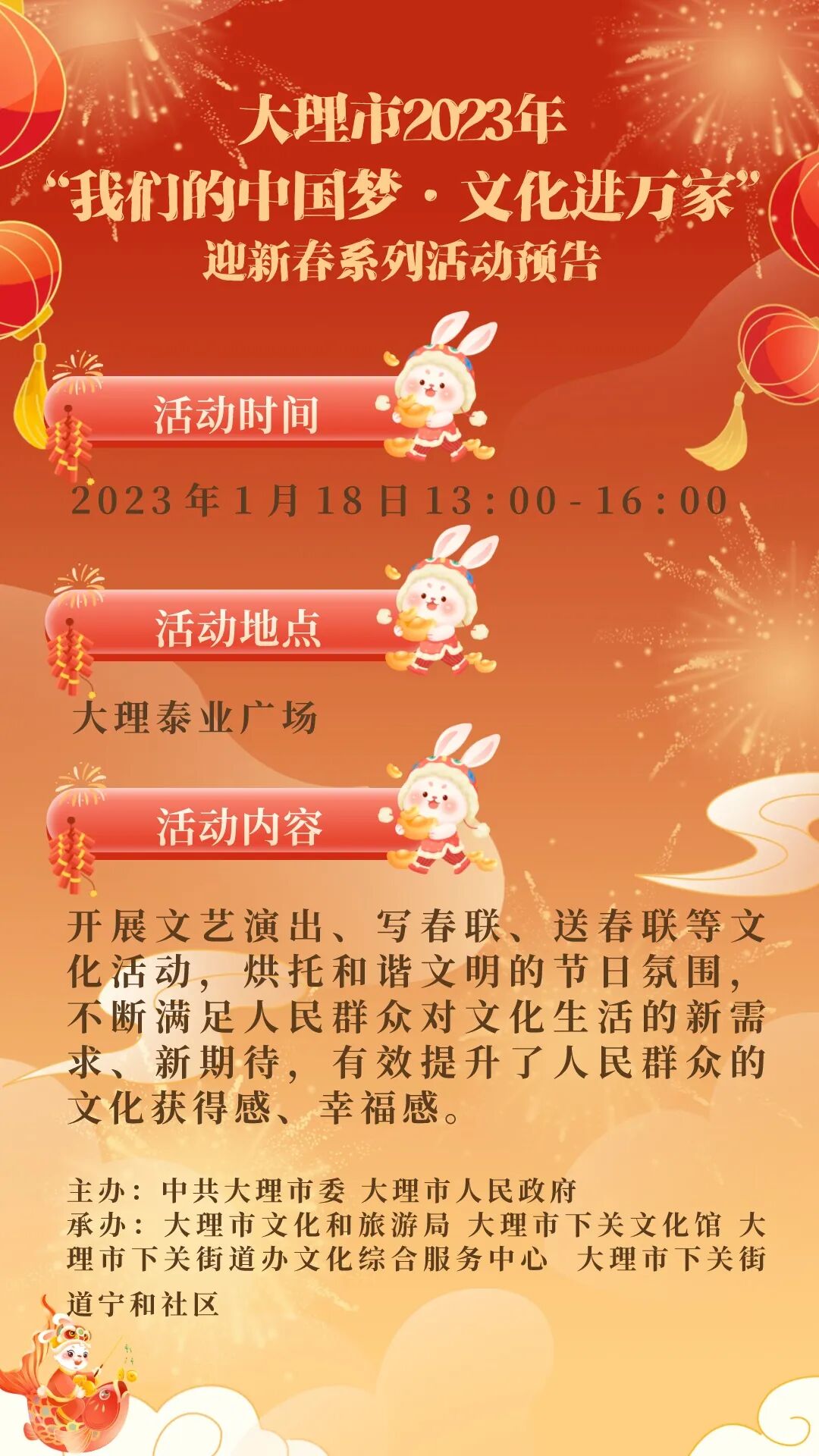 为深入宣传贯彻党的二十大精神,进一步弘扬中华民族传统文化,丰富春节期间群众文化生活,营造一个欢乐祥和的节日范围,打造有影响力的文化活动品牌,大理市下关文化馆在春节期间举办大理市2023年“我们的中国梦·文化进万家”迎新春文化系列活动。