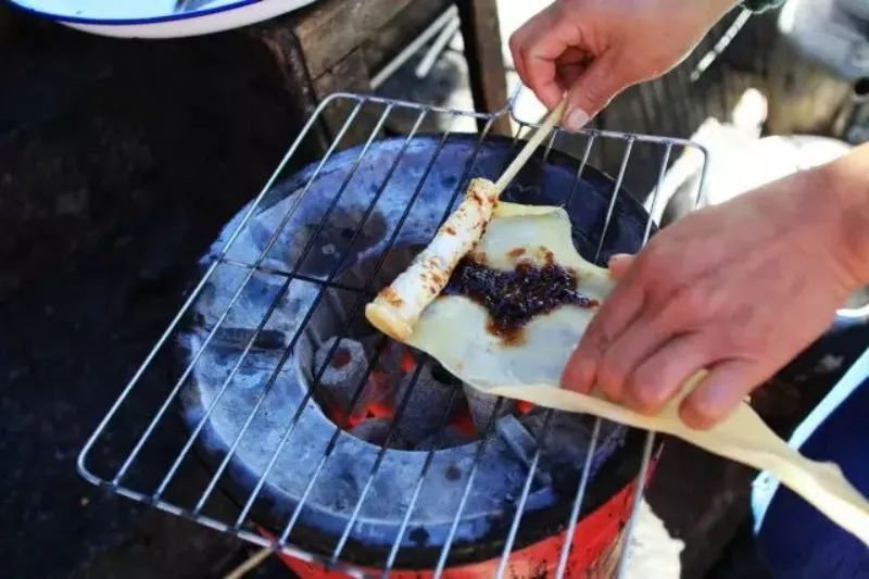 一根根串好的乳扇在炭火中一一摆开在大火的熏烤下逐渐变得柔软、膨胀炊烟中夹杂着一丝丝的奶香让人很是上头