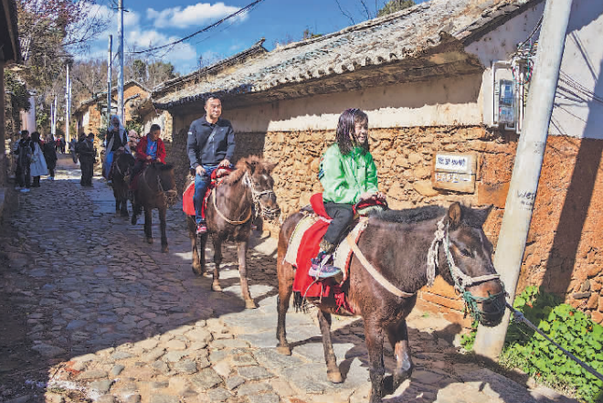 (在云南省大理市凤阳邑村,游客骑着马在滇藏茶马古道上体验马帮生活。据马场负责人介绍,最近骑马的游客每天在60人次以上。 赵黎浩 摄)