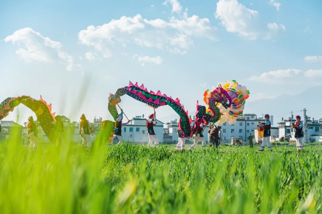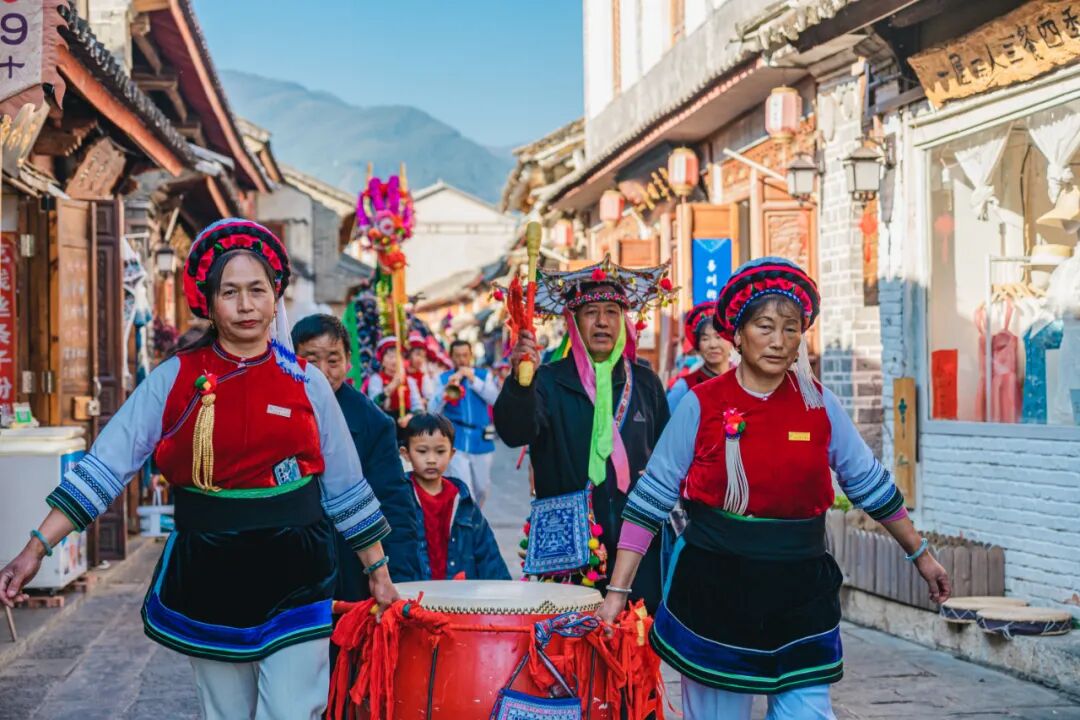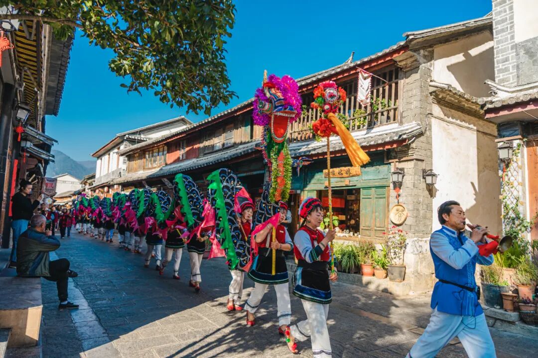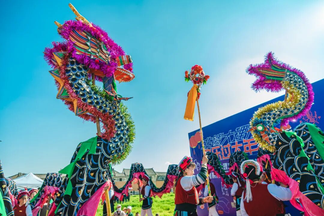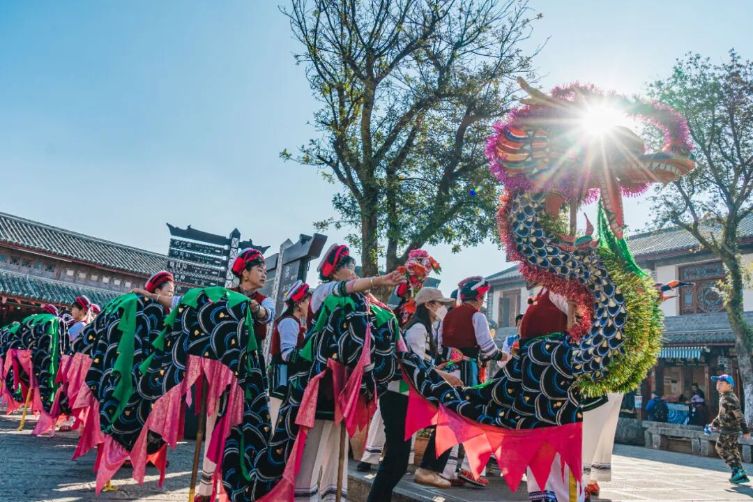 随着铿锵有力的锣鼓声响起,舞龙表演队在喜洲四方街开启巡演,欢快的节奏下表演者欢腾跳跃,现场锣鼓喧天、人潮汹涌。随后,非遗集市还举行了丰富多彩的文艺活动,白族霸王鞭、快板歌舞、彝族打歌、乐队演出等节目精彩纷呈,整场演出高潮迭起,营造出和谐、热闹的节日气息,集市也正式启动。