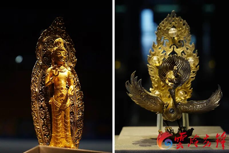 崇圣寺三塔中取出的《银背光金阿嵯耶观音立像》(左)和《银鎏金镶珠金翅鸟》(右)(拼版图片)