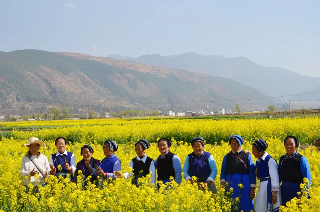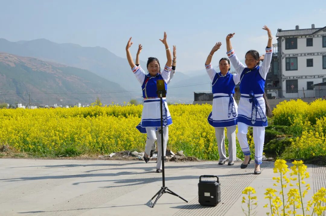 当地老年人民间文艺队也来到油菜花海里欣赏美景,拍照留念、唱白族调,享受油菜花开带来的幸福。老人们有感而发,唱起了白族调:“花上花,到处开满油菜花。今天是个好日子,我和姐妹们在一起……”