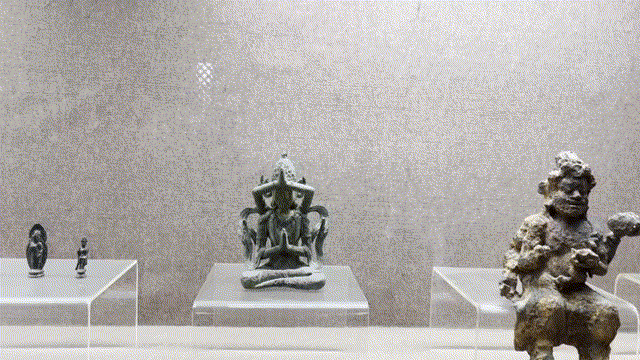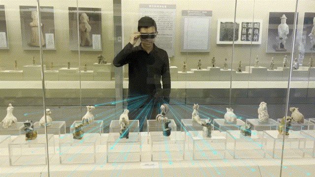 观众进入展厅,根据手中的导览手册及点位标识,找到对应文物,戴上AR眼镜注视文物,眼镜将自动捕捉文物外观进行智能识别。