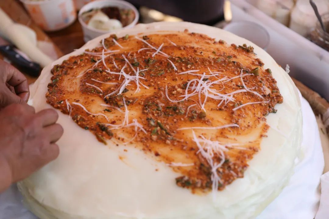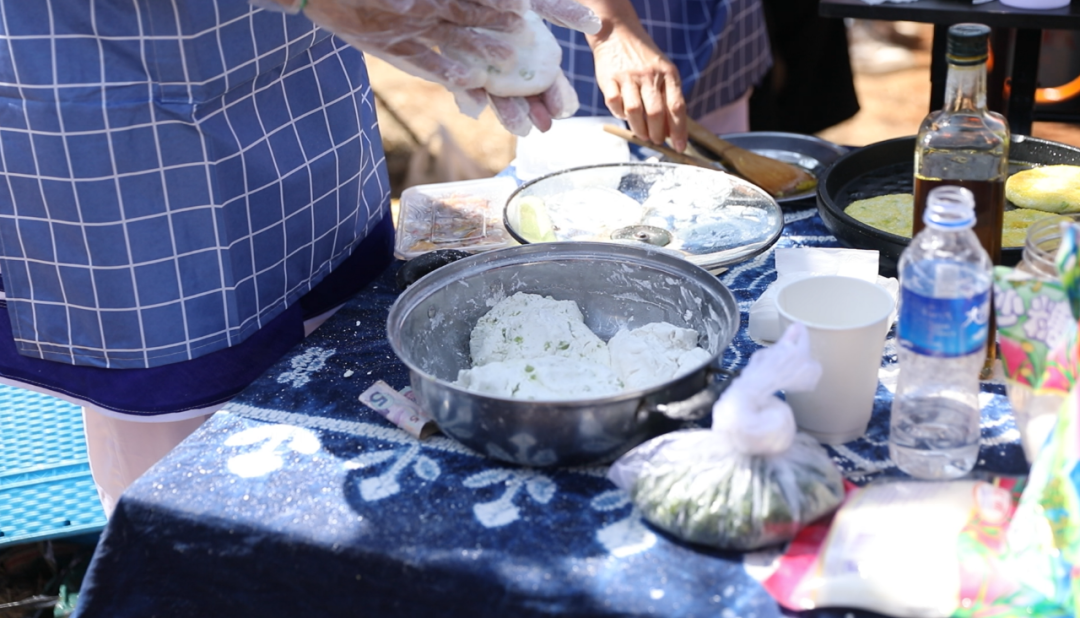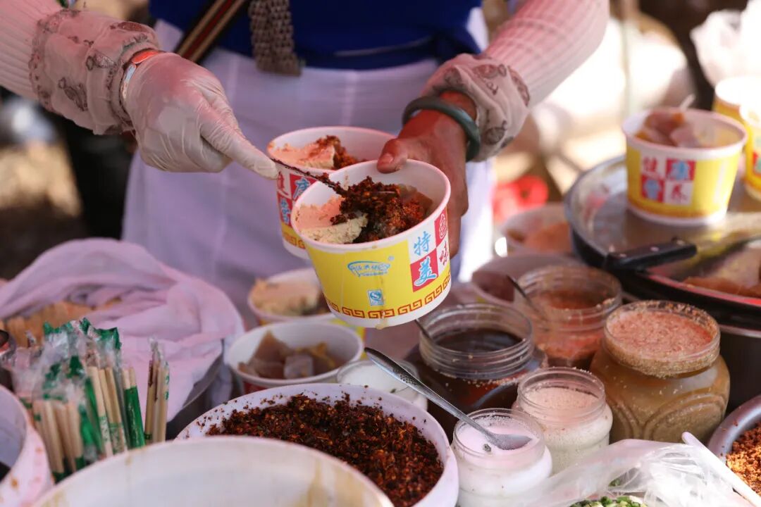 在梨花集市上,有白族传统小吃凉粉,凉虾、卷粉、糯米粑粑、福咖啡。
