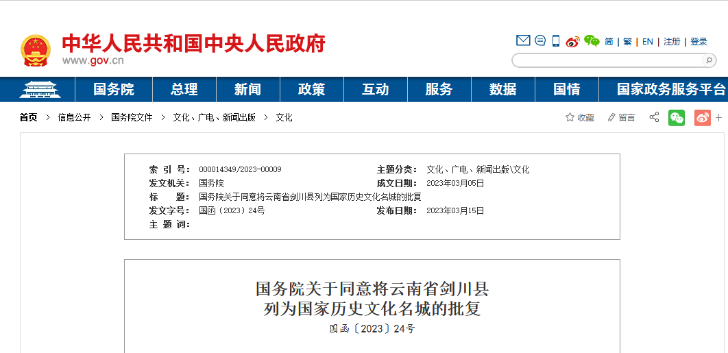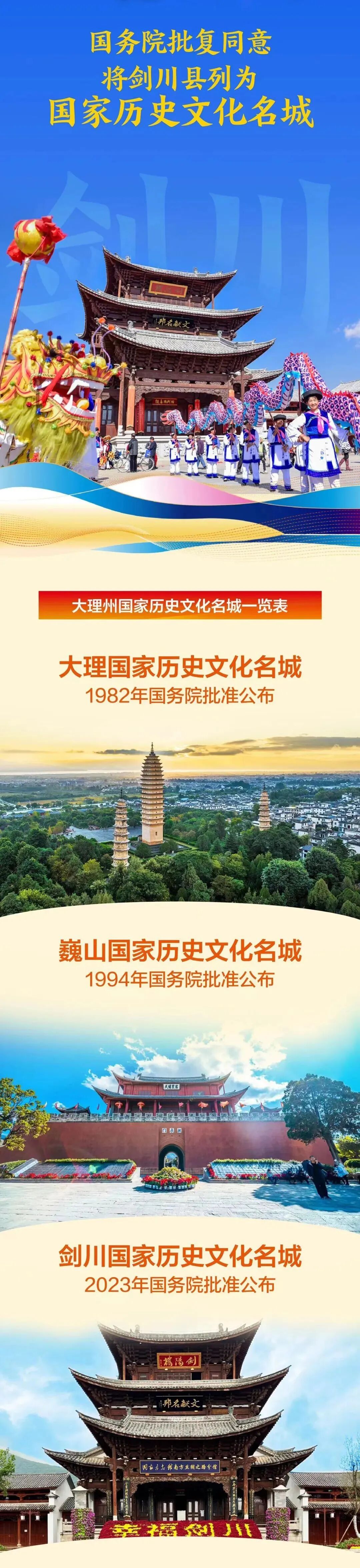 3月15日,中华人民共和国中央人民政府网站发布《国务院关于同意将云南省剑川县列为国家历史文化名城的批复》。大理州剑川县历史悠久、文化厚重,历史文化遗产资源丰富,民族风情浓郁,传统格局和历史风貌保存较好,地域特色鲜明,具有重要的历史文化价值。目前,大理州拥有3座历史文化名城,分别是大理、巍山和剑川。