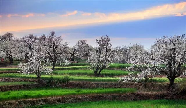 不同于刻意栽种的梨树那般整齐划一,奇峰的梨树遍布于山野之中、房前屋后,或三三两两,或聚集成群,随着地势的起伏,呈现出一种浑然天成的美感。万树花开,层层叠叠,似云、似雪,又似一幅意蕴清雅的传世丹青。
