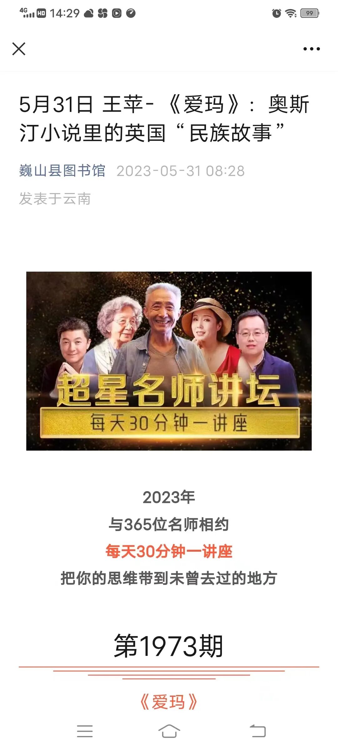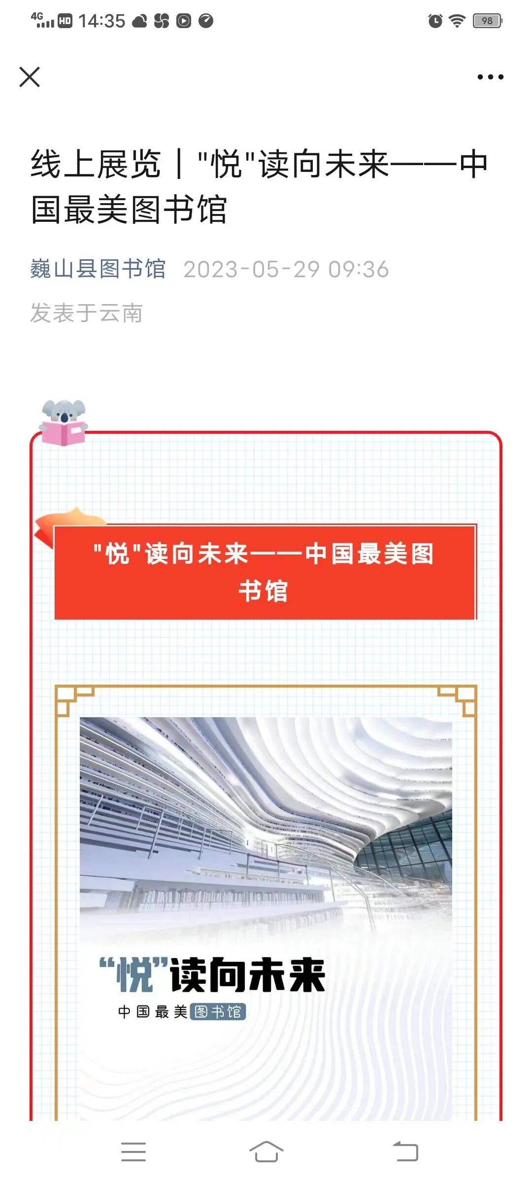 同时,巍山县图书馆还推出了丰富多彩的线上活动。依托巍山县图书馆微信公众号,一是推出了《时光不再,惊羡你温柔如初》《本和我》《黑骏马》等适合孩子们阅读的优秀少儿书籍,激发他们的阅读兴趣;二是推出了《爱玛》:奥斯汀小说里的英国“民族故事”等名师讲坛,让孩子们对被誉为“散文中的莎士比亚”的奥斯汀和她的代表作《爱玛》有了一定的了解和认识;三是举办了“图画为马 文字作舟”——儿童图书大奖巡礼、"悦"读向未来——中国最美图书馆等线上展览,让孩子们了解中国最美图书馆、国内外知名的儿童图书奖及部分获奖作品,为他们的童年增添缤纷的色彩。