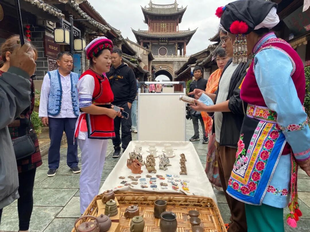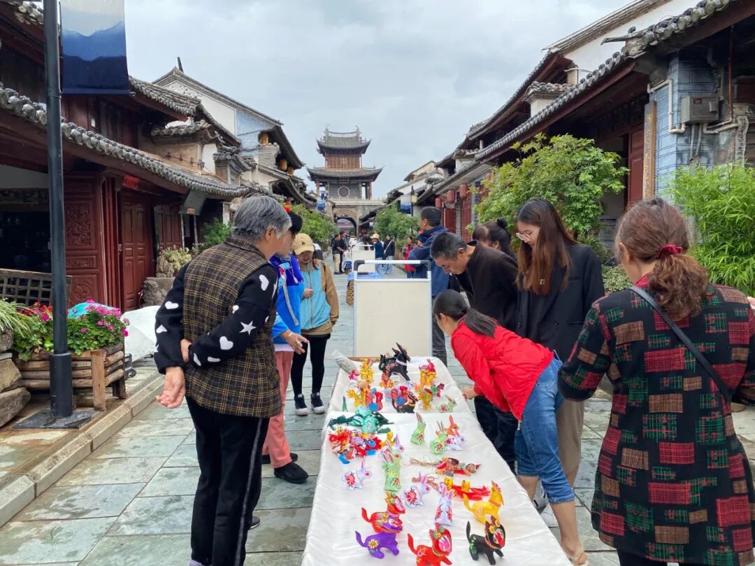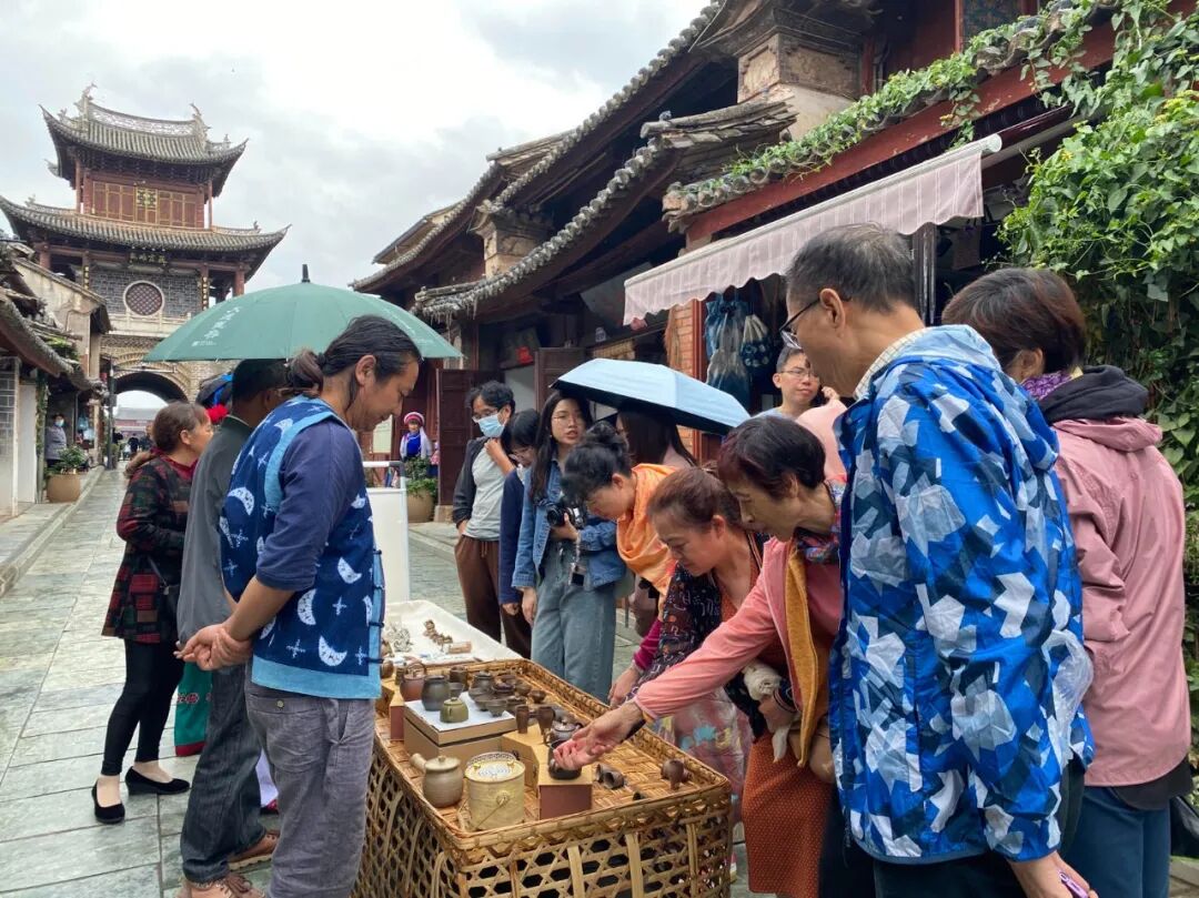 在大理州非遗中心的指导下,“巍山南街非遗集市”荟萃了大理市、剑川县、巍山县三个中国历史文化名城的12个传统技艺类非遗项目,产品琳琅满目,传承人各显神通。集市热闹起来,人们看非遗歌舞乐、品白族三道茶、试儿童玩具、询瓦猫、买陶器。