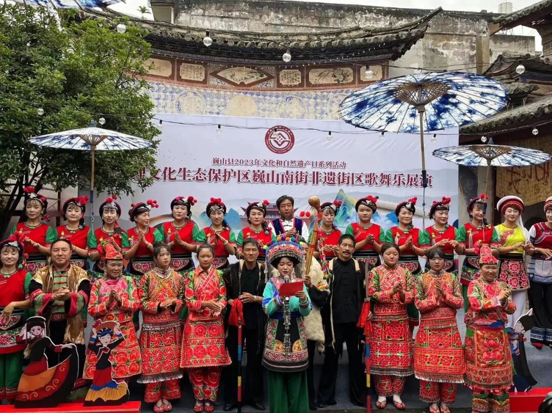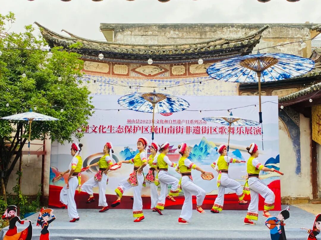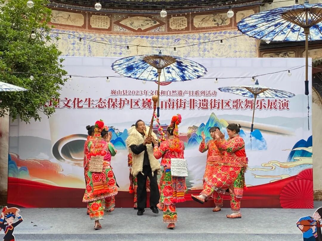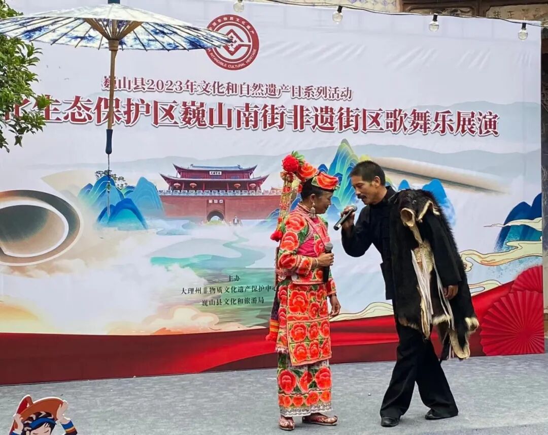同时,在南街的“非遗+旅游”示范点,洱源县斯甘俏艺术团的金花打起霸王鞭、敲起八角鼓,巍山县小三家村彝族打歌传习所的东山打歌队,唱起打歌调,耍起大刀舞,大理文化生态保护区巍山南街非遗街区歌舞乐展演持续一个小时,现场掌声不断。这次活动,汇聚了大理市、剑川县、洱源县、巍山县的近60位非遗传承人(群),他们在非遗集市中,不仅展现了技艺、加强了交流,也付出了汗水、留下了回忆。这不仅是一次共同庆祝2023年“文化和自然遗产日”的聚会,也是一次充分展现大理文化生态保护区建设成果的盛会。