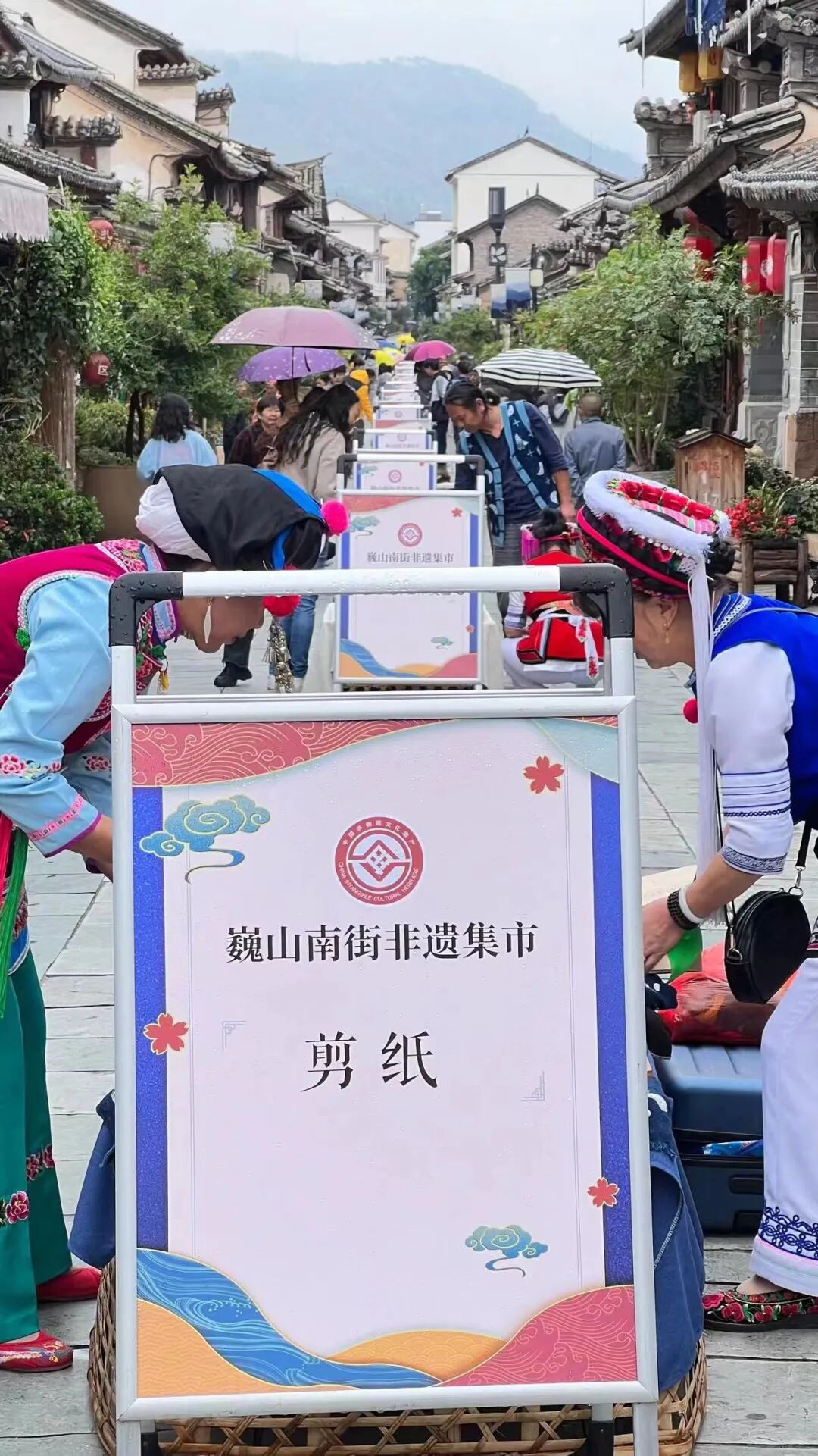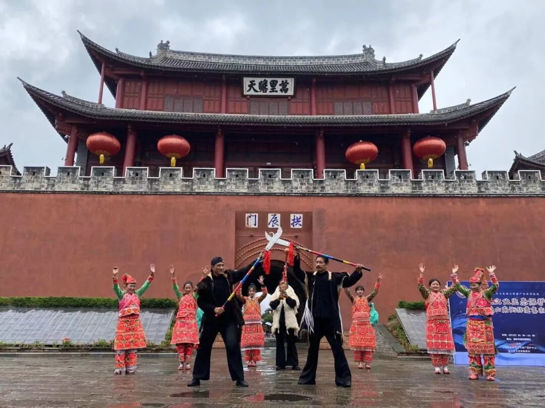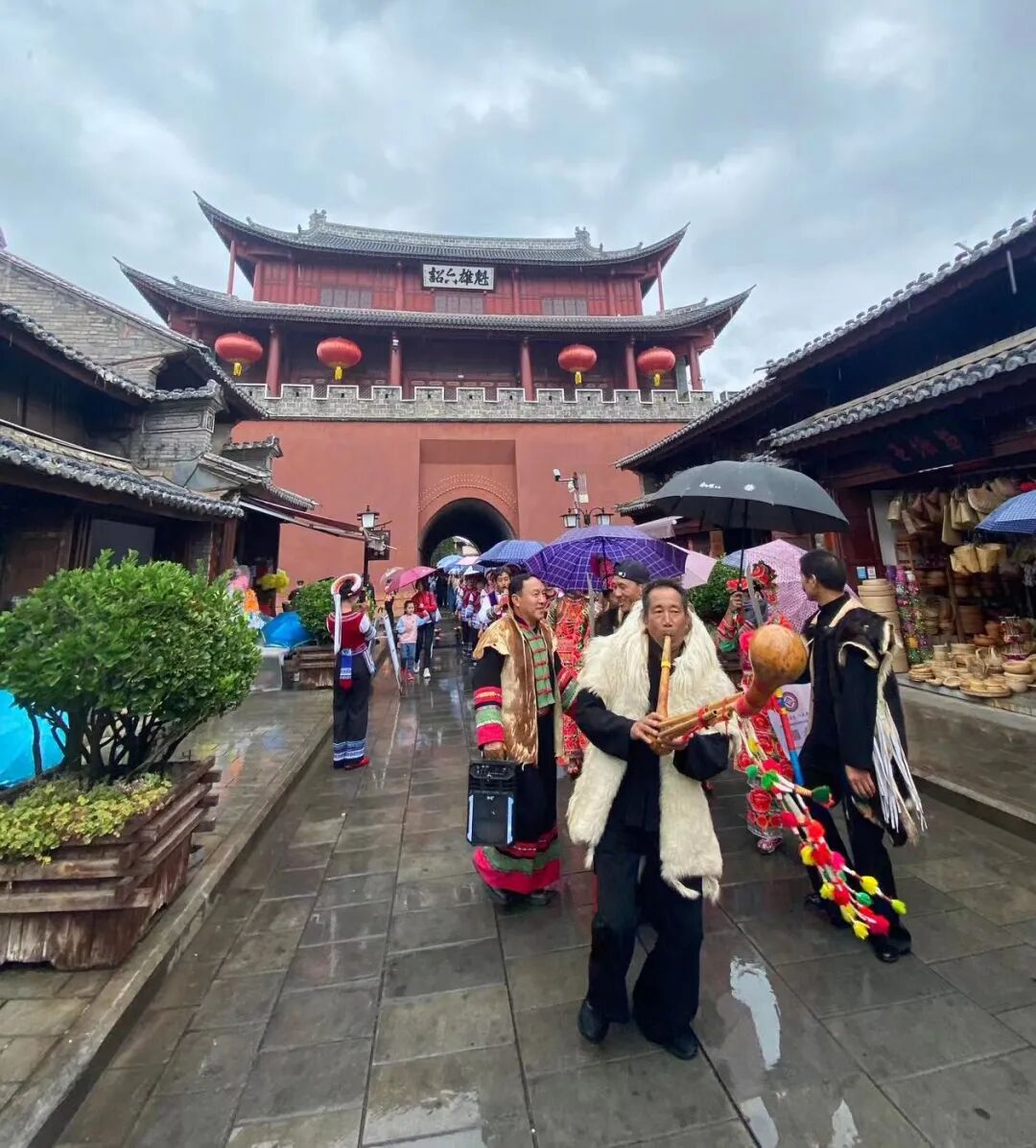 6月10日上午,霏霏细雨中,由白族霸王鞭、彝族打歌、扎染服饰秀组成的游演长龙,从拱辰楼出发,自北向南,引领着南诏古街上的游客,轻松而欢快地汇入“巍山南街非遗集市”,在“非遗赶大集”中,“享传统文化,购非遗好物”,共同度过了2023年的“文化和自然遗产日”。