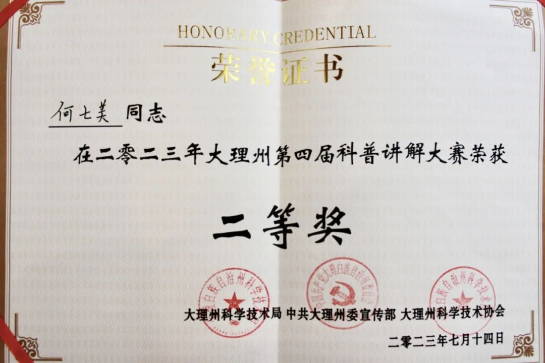 经过7月13日半决赛的选拔,排名前20的优秀选手进入到最终的总决赛环节。大理州博物馆讲解员何七美以第一名成功晋级总决赛,以“如果编钟会说话”为题,将中国的“编钟”何以成为乐器的原理娓娓道来。讲解张弛有度,内容严谨而不失有趣,以第三名佳绩荣获大理州第四届科普讲解大赛二等奖以及最佳形象奖。接下来将代表大理州参加云南省科普讲解大赛。