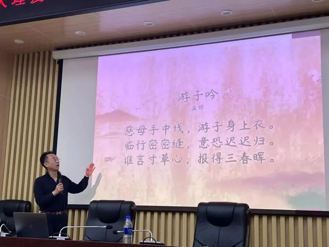 丁进饱含深情的演讲打动了在场的家长和小朋友们,演讲结束后,他还带领小朋友们朗诵起了国学经典篇目,并用语言和肢体动作相结合的方式,寓教于乐地教会了小朋友们《游子吟》《出塞》等古诗词。