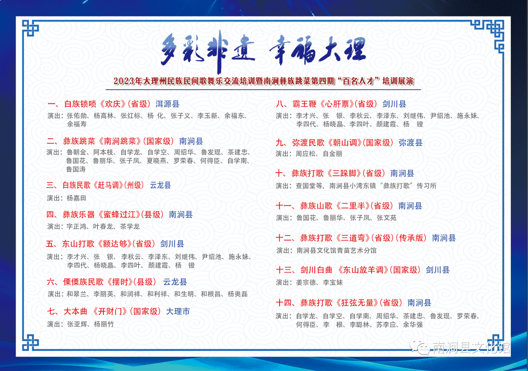 2023年8月8日至11日,大理州民族民间歌舞乐交流培训暨南涧彝族跳菜第四批“百名人才”培训,即将在中国民间跳菜艺术之乡南涧县举办。