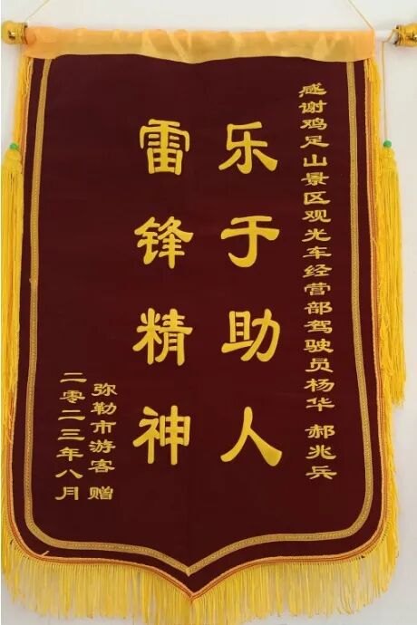 8月28日,宾川鸡足山旅游投资开发有限公司观光车经营部收到一面写有“乐于助人、雷锋精神”的致谢锦旗,深切表达了对景区工作人员的感激之情。