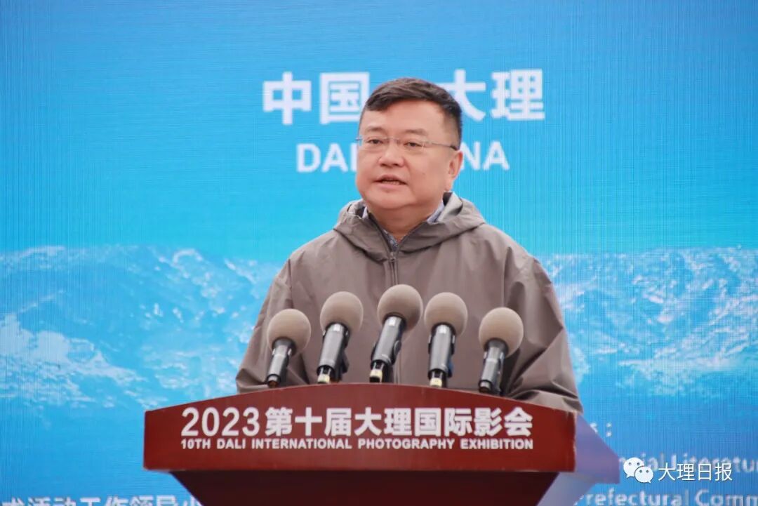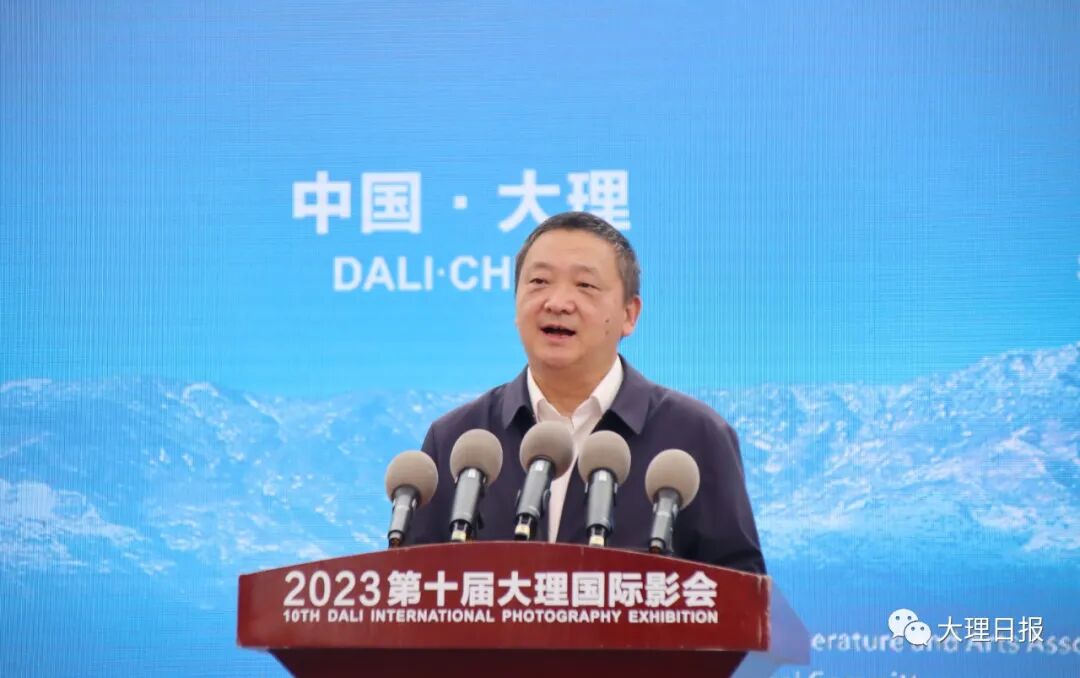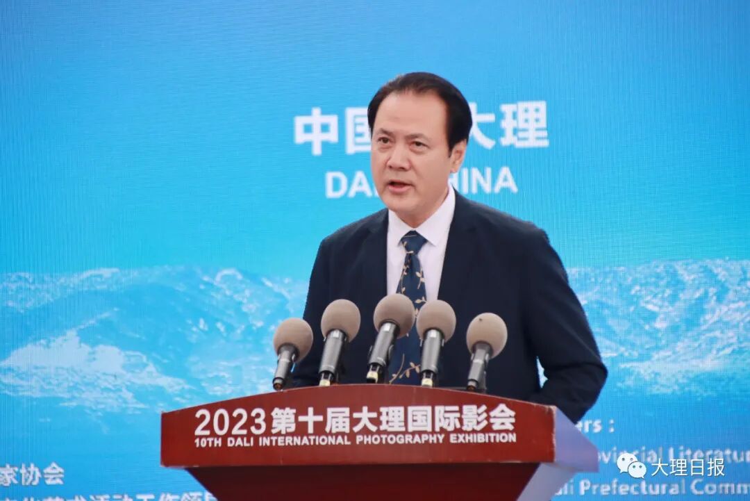 杨国宗致辞时指出,美丽大理,让艺术走进生活。大理是全国唯一的白族自治州,是习近平总书记关心牵挂的地方,天成的生态美景、厚重的历史文化、多彩的民族风情,时刻让人行在景中、走在画里、美在心田,被誉为“天然摄影棚”。大理国际影会作为具有国际影响力的城市公共文化品牌,是摄影人与观众共享的摄影艺术视觉盛宴,也是中外人文交流、文化科技交融的国际盛会,更是向世界展示大理生态之美、人文之美、绿色之美、发展之美的最佳窗口。创意大理,让摄影见证美好。苍山洱海的天光云影、蝴蝶泉边的悠扬歌声、茶马古道的马蹄阵阵,总能令人回归心灵、回归本真、回归宁静,让大理成为首选的“摄影创作基地”,成为海内外旅游爱好者心驰神往的“旅拍胜地”。大理无处不在的美,必将催生无处不在的创意拍摄空间,用光与影的独特镜头发现大理的美,是展现大理之魅的最佳表达方式,在大理,天天都是摄影节,人人都能成为摄影师,人人都能拍出好照片,人人都能创作出更多更美的精品佳作。文化大理,让影像流传经典。十届影会华彩绽放,摄影达人群英荟萃,成为海内外摄影艺术家眼中“摄影界的世博会”“中外影像艺术品交流收藏的大平台”。大理国际影会将立足把大理打造为中国摄影界艺术品交易热土和未来摄影师孵化基地,汇聚优质画廊资源,搭建专业交易平台,让参展作品的艺术价值及收藏价值充分释放,推动镜头下的大理文旅产业联动发展、相得益彰。苍洱美景君须记,光影流霞存菁华。2023第十届大理国际影会,注定是一场光与影的传奇、风与景的邂逅。诚挚邀请广大海内外摄影艺术家和旅游爱好者乘风前行,来有风的地方,仰望星空,与苍山洱海做伴,踏歌而行,与风花雪月共舞,亲身体验有一种生活叫大理,让更多人走进大理、了解大理、热爱大理的文化之美、摄影之美、艺术之美、生活之美。