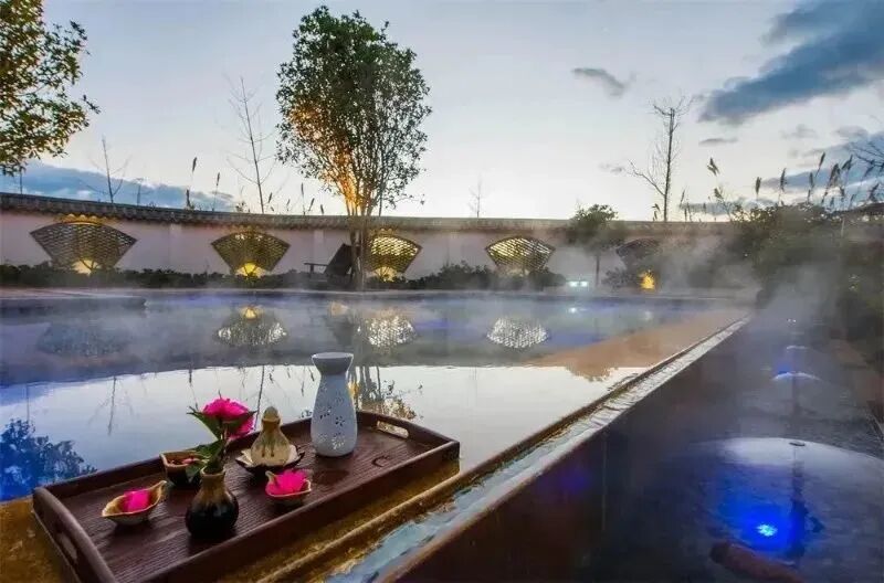 下山口温泉小镇位于洱源县右所镇下山口村,小镇上温泉度假酒店林立,普陀泉温泉度假酒店是下山口温泉小镇上较大且具有代表性的综合型温泉度假服务区,普陀泉绿树成荫,花木繁盛,30多个特色温泉池,星星点点散落在花草丛林间。泉水富含偏硅酸、锶、钙等多种有益于人体健康的元素。沐浴在仿佛仙境一般的温泉里,当热气腾腾的水流拥抱着你,在水汽氤氲中,忘却喧嚣,身心与大自然交融,所有的烦恼都被抛到脑后。偷得浮生半日闲,无忧无虑泡温泉,也是一种难得的享受吧!