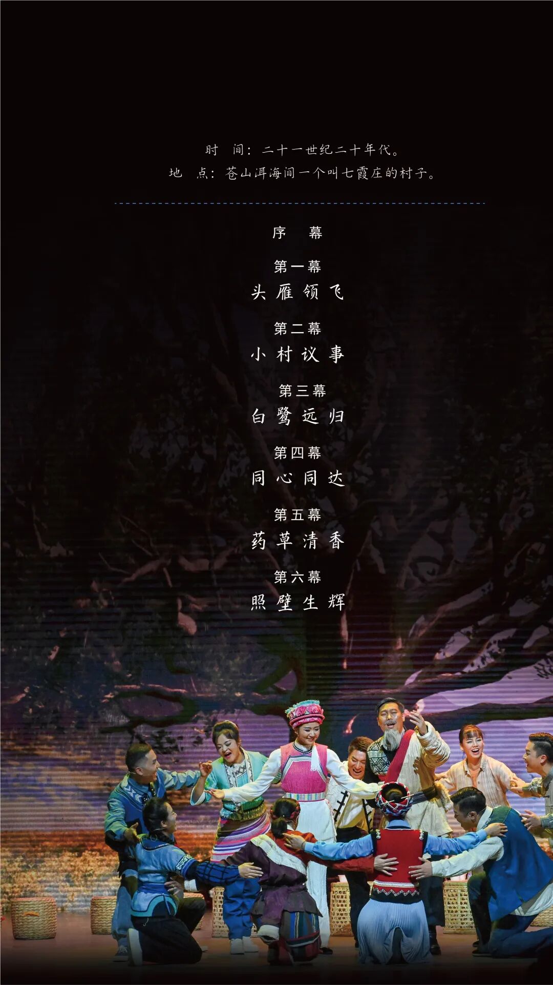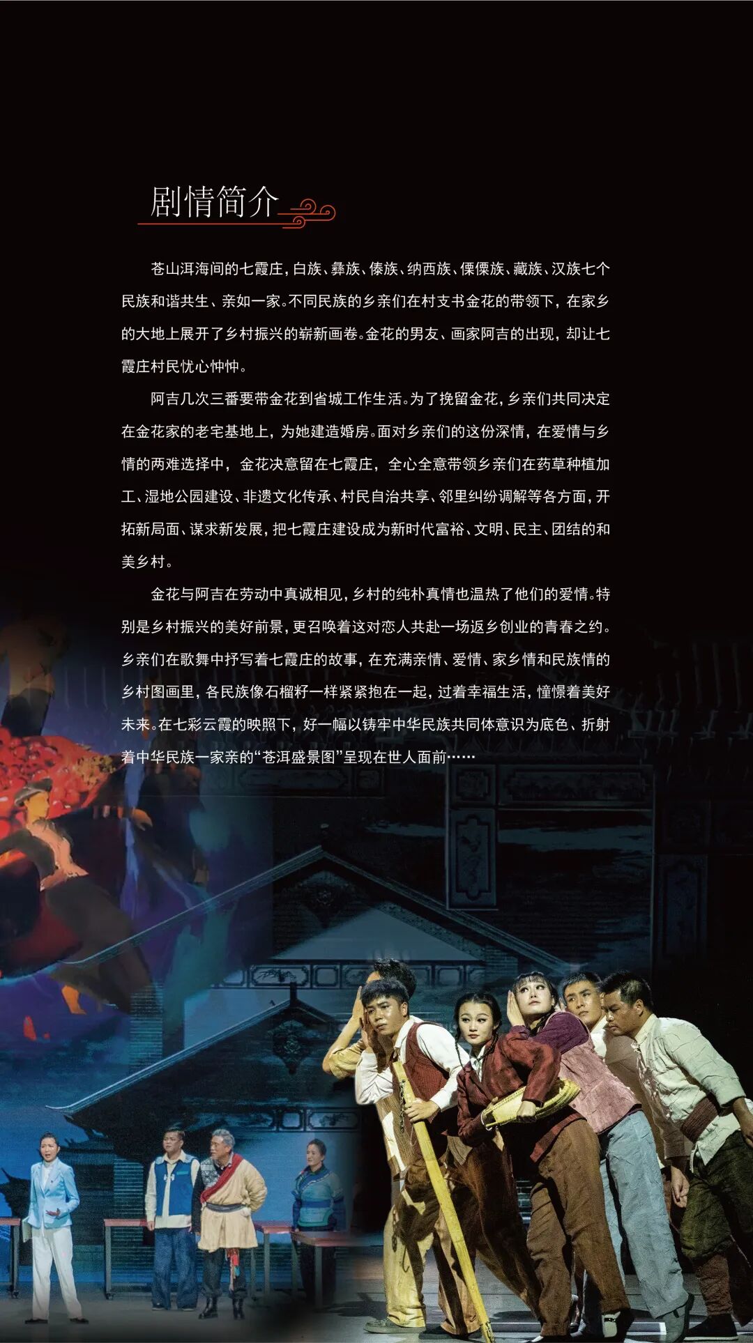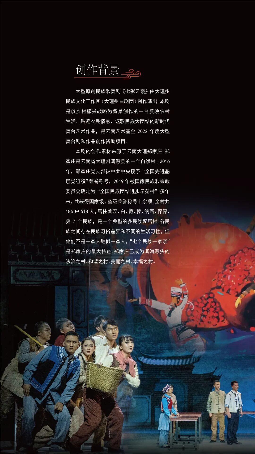 《七彩云霞》以曾经获得“全国民族团结示范进步村”等十余项国家级、省级荣誉称号的大理洱源郑家庄为创作素材,通过白族、彝族、傣族、纳西族、傈僳族、藏族、汉族七个民族的歌舞故事描绘出新时代农村农民风采和铸牢中华民族共同体意识的盛世图景,是大理州白剧团历史上首度创排的歌舞剧。