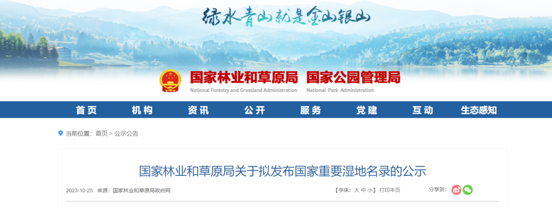 根据《中华人民共和国湿地保护法》《国家重要湿地认定和名录发布规定》有关要求,天津市武清区大黄堡等29处湿地已通过材料审查、现地核实、专家论证、部门意见征求,并经国家林业和草原局局务会审议同意,拟认定为国家重要湿地。现将29处湿地有关信息予以公示(详见附件),公示期为2023年10月25日至11月1日(5个工作日)。如有异议,请在公示期内反馈国家林业和草原局湿地管理司(电话:010—84239339,邮件:guojiazysd2023@126.com)。