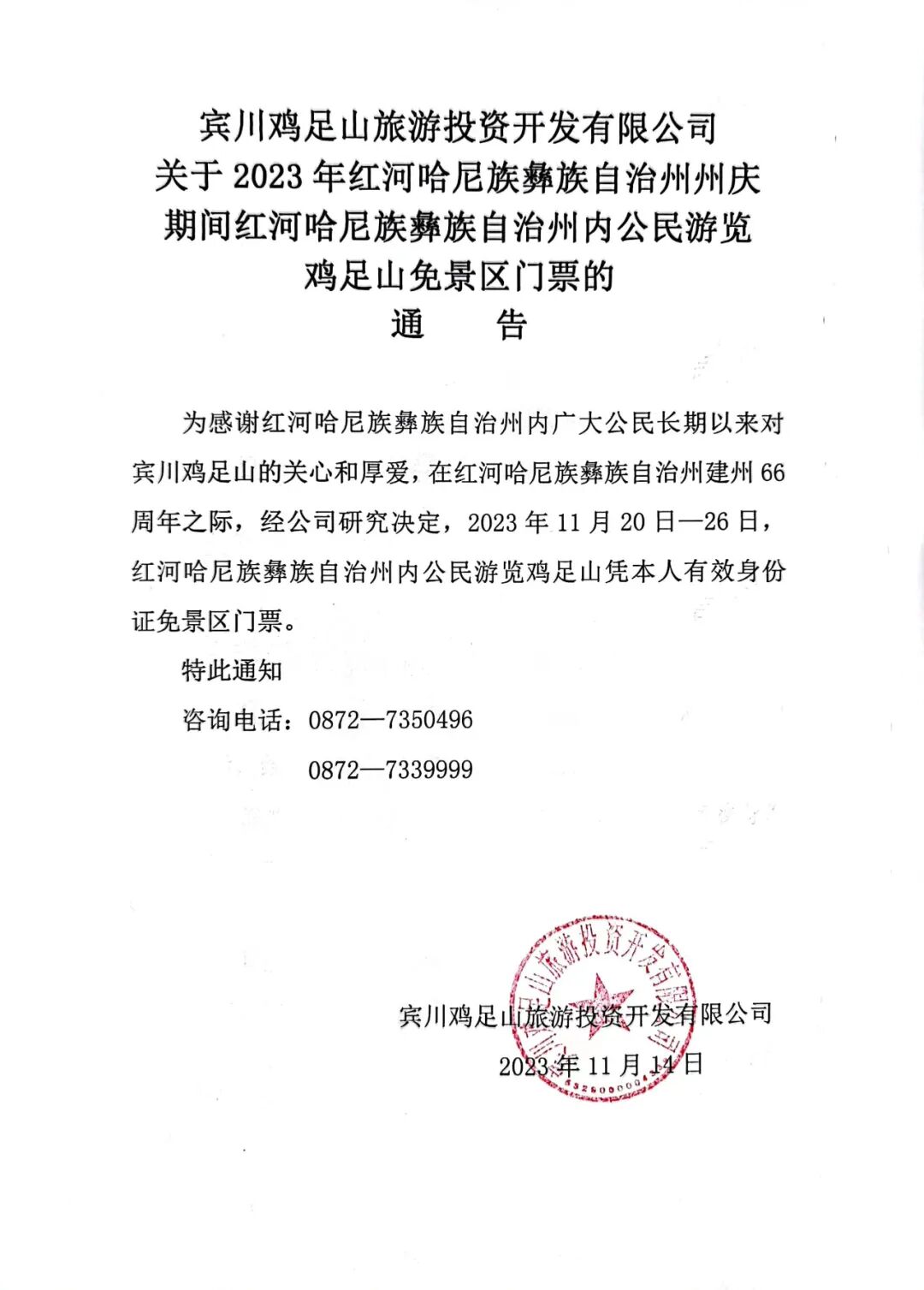 为感谢红河哈尼族彝族自治州内广大公民长期以来对宾川鸡足山的关心和厚爱,在红河哈尼族彝族自治州建州66周年之际,经公司研究决定,2023年11月20日—26日,红河哈尼族彝族自治州内公民游览鸡足山凭本人有效身份证免景区门票。