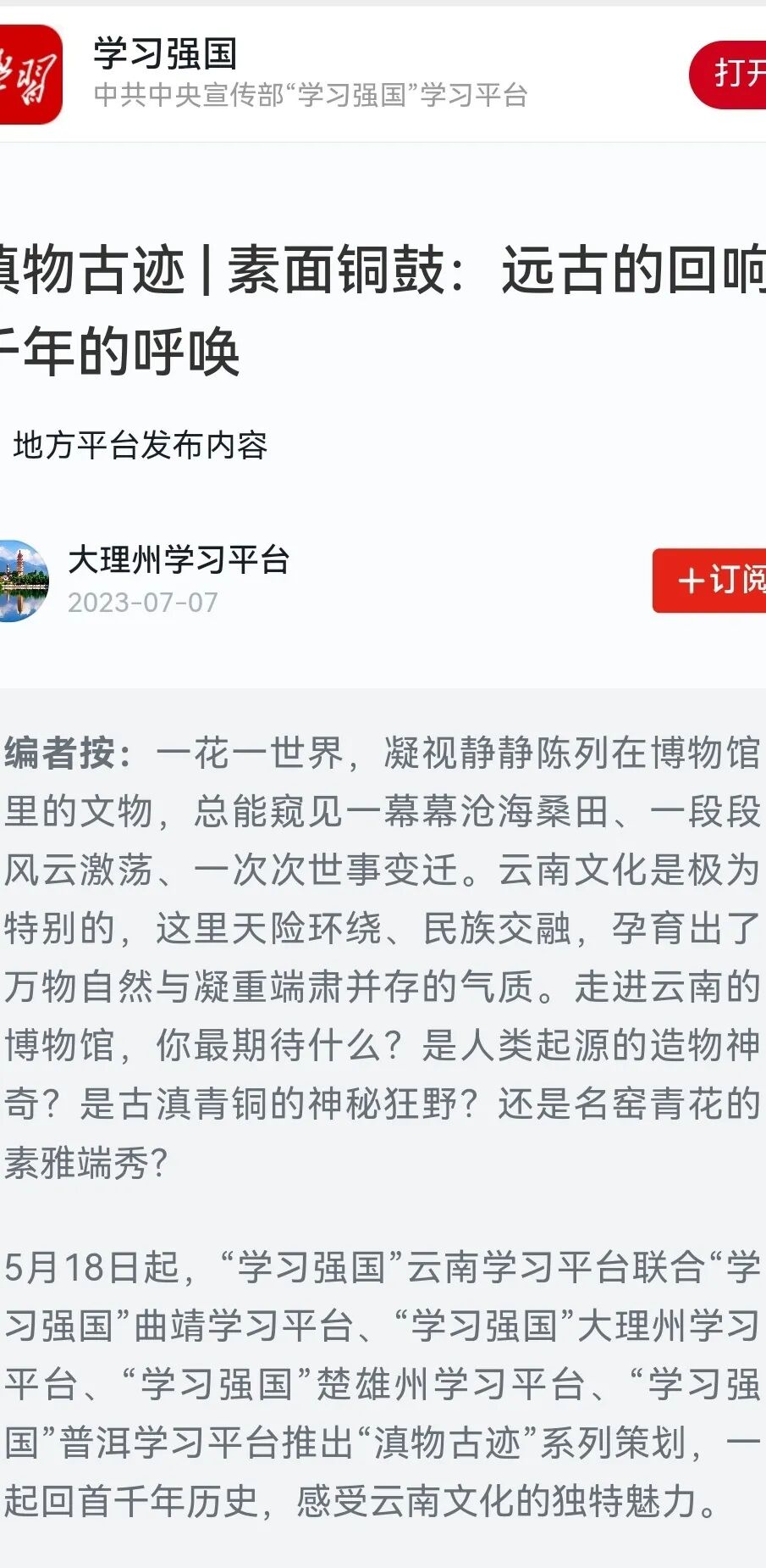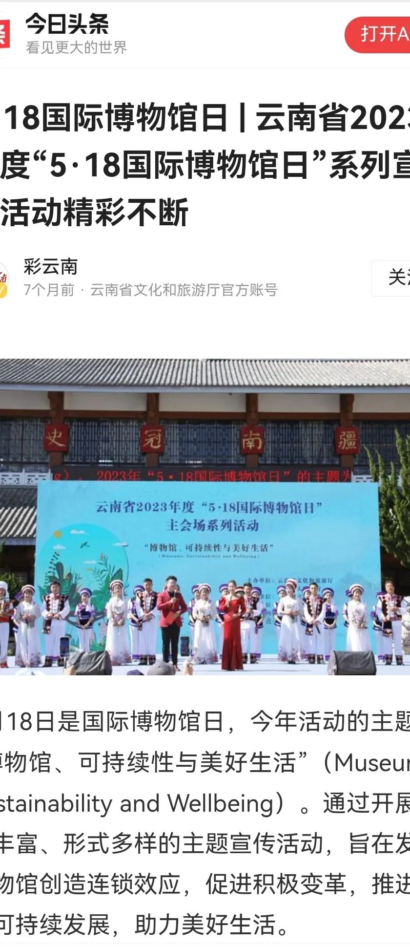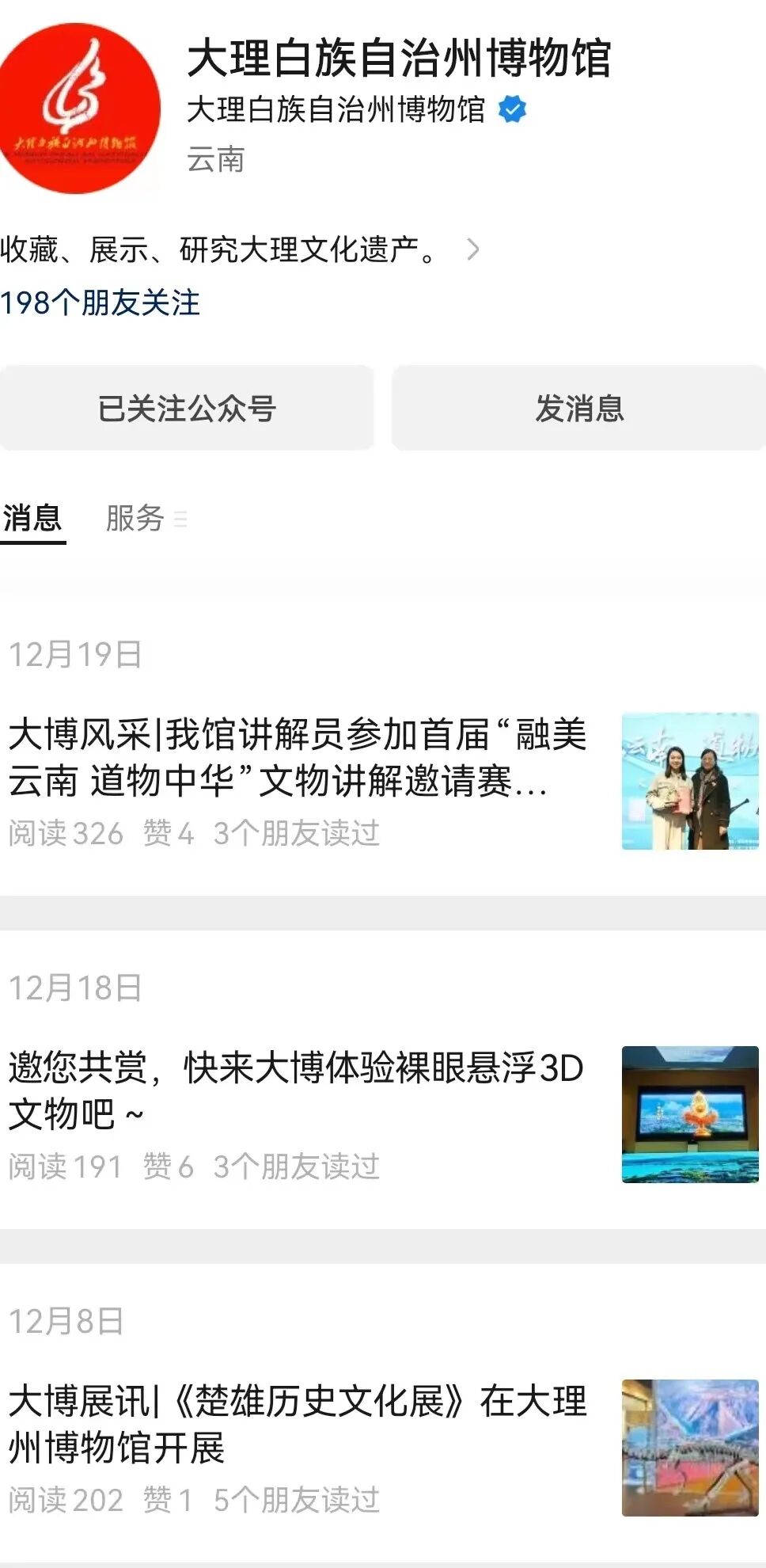 大理州博物馆微信公众号累计关注人数达到12186人,通过微信公众号平台共发布文章87篇、浏览总量为34784次;通过大理州博物馆官网进行媒体宣传,网站总访问量达到224767次。通过文旅头条、大理文旅App、春城晚报、开屏新闻、云南网、大理广播电视台、大理日报等公众媒体进行宣传报道,共计报道60余次、阅读量30余万次。积极与“学习强国”平台合作,通过“学习强国”云南学习平台策划的“滇物古迹”栏目,推出大理州博物馆馆藏文物,目前已宣传报道了鎏金铜凤鸟、东汉陶楼模型、南诏仓储碑等共14期一级文物;大理州人民政府网微信公众号也进行了相关宣传报道。2023年“5·18国际博物馆日”,以“循有风足迹,览文博魅力”为主题通过央视频、中新网、云南网、云视网、七彩云端、FM91.8云南交通之声、文旅头条、游云南等官方媒体,云南省文化和旅游厅官方抖音号、视频号、微博、大理文旅、公共文化云(省文化馆)等政务平台进行直播,观看量为49.15万,主会场系列活动在新华网、文旅中国、中国网、云南网、央视频、文旅头条、今日头条、云报、开屏新闻等媒体,通过图文、视频等方式共刊播20余条相关报道。