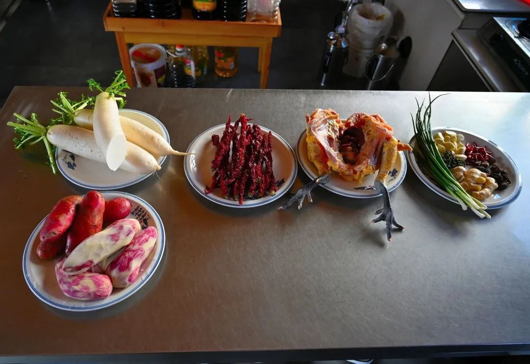 “剑川三样菜”是剑川的一道特色美食,土鸡宰杀了清炖、黄焖各一份为一道菜,油炸七彩洋芋为第二道菜,清水炖萝卜为第三道菜。