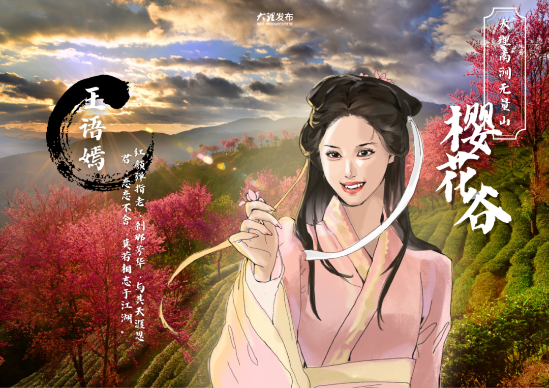 金庸笔下的无量山,是一片深谷秘境,白雾锁谷,玉龙悬空。段誉为逃脱追捕而从山崖坠入樱花谷中,上万株冬樱花在茶田中竞相绽放,云雾缥缈变幻,宛若仙境。段誉在谷中秘境习得了绝世武功,邂逅了“神仙姐姐”。