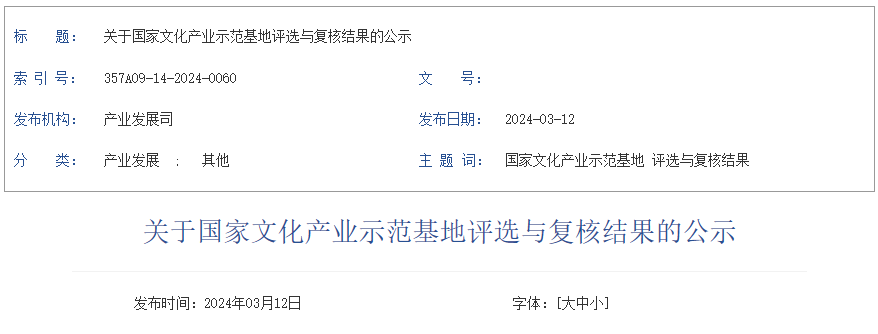 根据《国家级文化产业示范园区(基地)管理办法》和《文化和旅游部办公厅关于开展2023年国家文化产业示范基地申报与复核工作的通知》(办产业发〔2023〕90号),经评审,现将新一批国家文化产业示范基地拟命名名单、拟保留命名国家文化产业示范基地名单予以公示(附后)。
