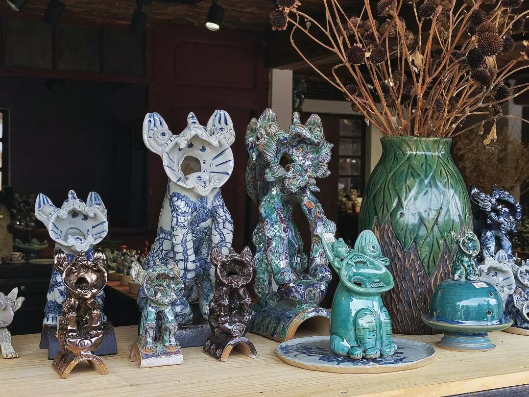 在巍山古城,明信片、冰箱贴、贴纸、钥匙扣等各式各样的瓦猫文创,以水彩画、简笔画、扎染等方式呈现瓦猫的不同形象,还有平安喜乐、好人相逢、四季平安等美好祝福,让人心生喜爱。