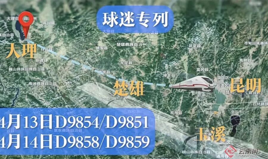 凡购买4月13日D9854/D9851和4月14日D9858/D9859次球迷专列列车车票往返大理、楚雄与玉溪的旅客,均可免费得到4月13日19:30在玉溪高原体育运动中心体育场进行的云南玉昆主场对阵无锡吴钩比赛的球票一张。