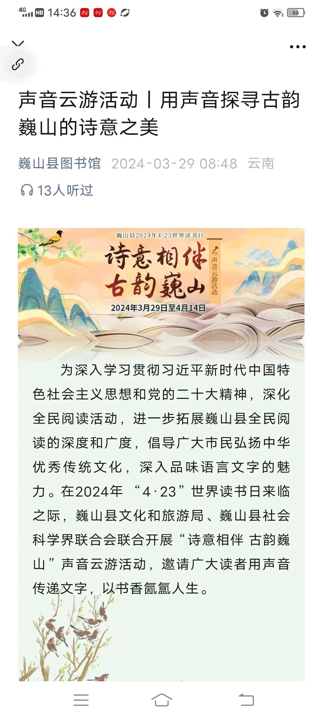 3月29日至4月14日,在“4·23”世界读书日来临之际,巍山县举办了“诗意相伴 古韵巍山”声音云游活动,邀请热爱朗读的广大读者一起朗读,用声音传递文字,以书香氤氲人生。活动由巍山县文化和旅游局、巍山县社会科学界联合会主办,巍山县图书馆、中国邮政集团有限公司云南省巍山县分公司承办。