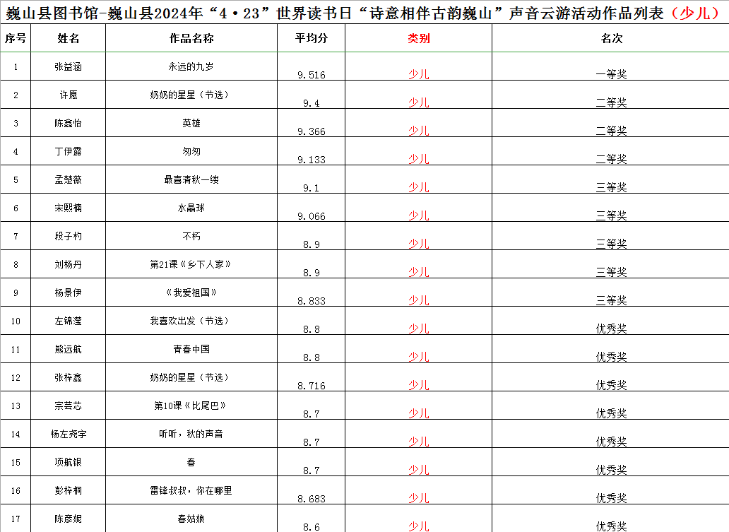 活动受到了广大朗读爱好者的欢迎,参加活动的有老师、医生、学生、居民等,他们踊跃报名,积极录制、上传作品,共收到了《灯》《祖国啊,我亲爱的祖国》《我眼中的诗意巍山》《雷雨》等作品101件,其中成人作品39件,少儿作品62件。朗读者们有的朗诵诗歌、有的朗诵散文、有的朗诵小说,用优美的声音和饱满的激情赞美祖国、故乡、英雄、老师......用声音传递感情、传递美好,表达了对朗读的无比热爱之情。经过专家评委的评选,评出了成人组一等奖1名、二等奖3名、三等奖4名、优秀奖11名,少儿组一等奖1名、二等奖3名、三等奖5名、优秀奖19名,将在“4.23”世界读书日期间为获奖朗读者颁发奖状及奖品。