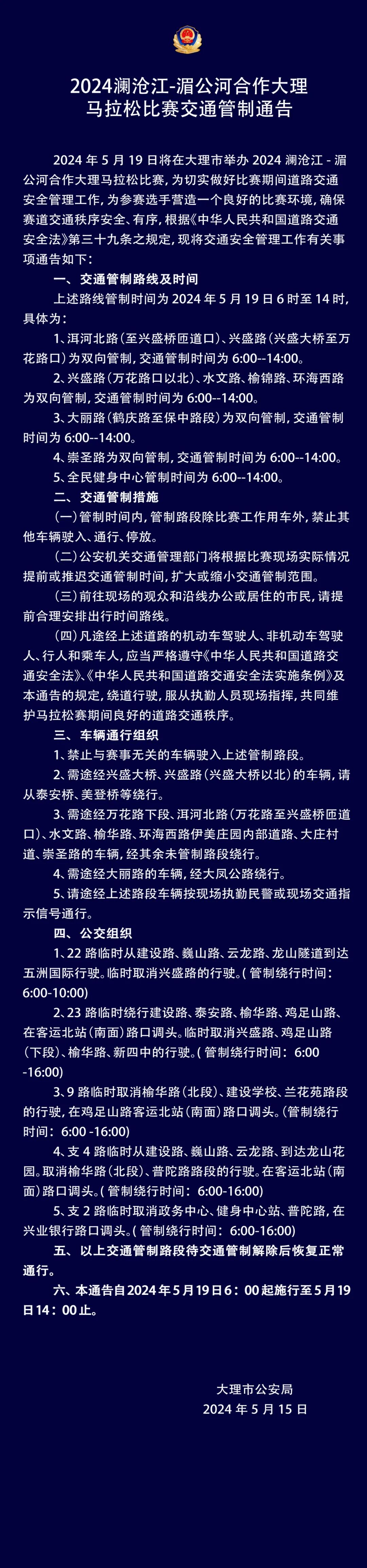 2024澜沧江-湄公河合作大理马拉松比赛交通管制通告
