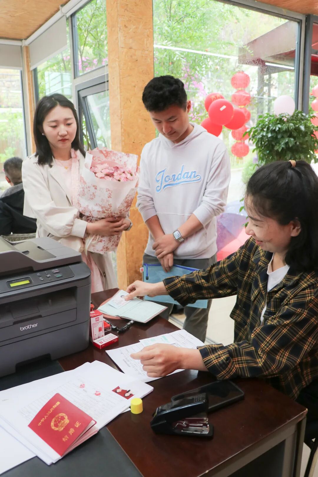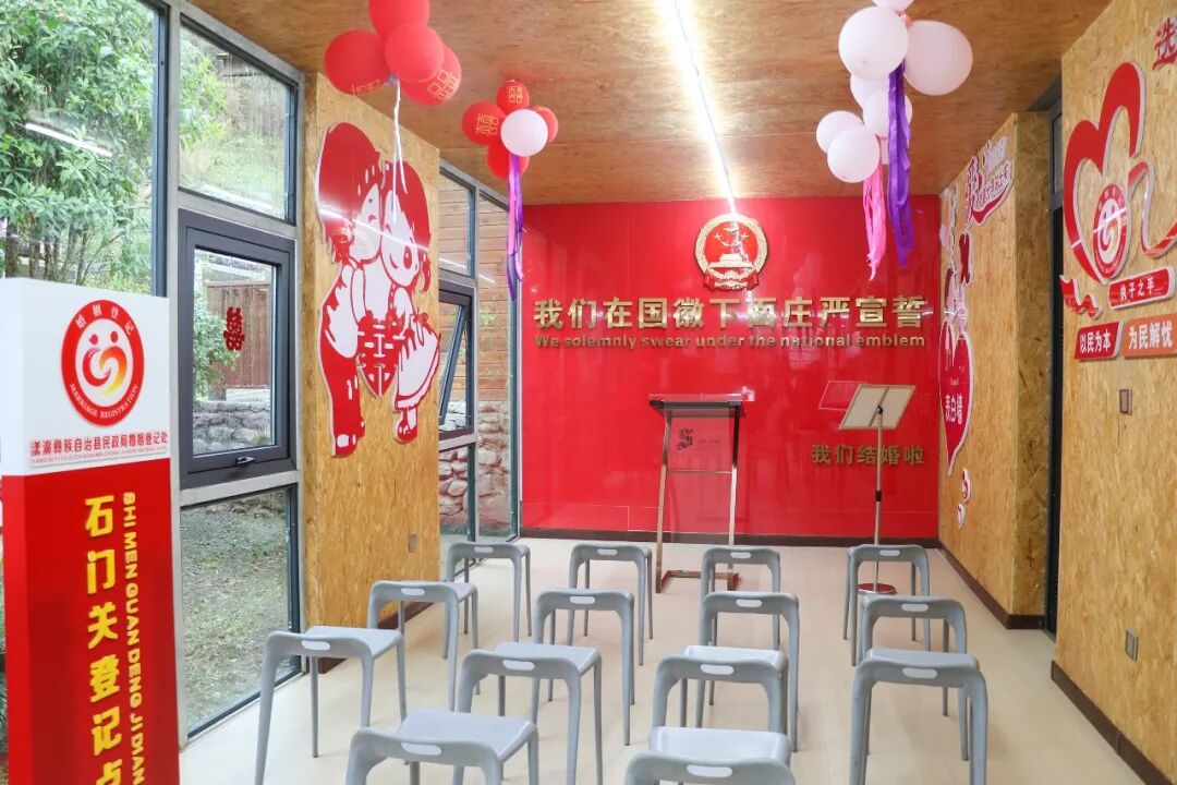 走进石门关婚姻登记点,甜蜜的气息扑面而来。首先映入眼帘的是红色的“誓言墙 ”,在气球的点缀下,郑重却又不失浪漫。婚姻登记大厅内设结婚登记室、候登区,便民服务区、颁证区等。