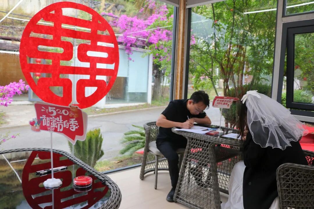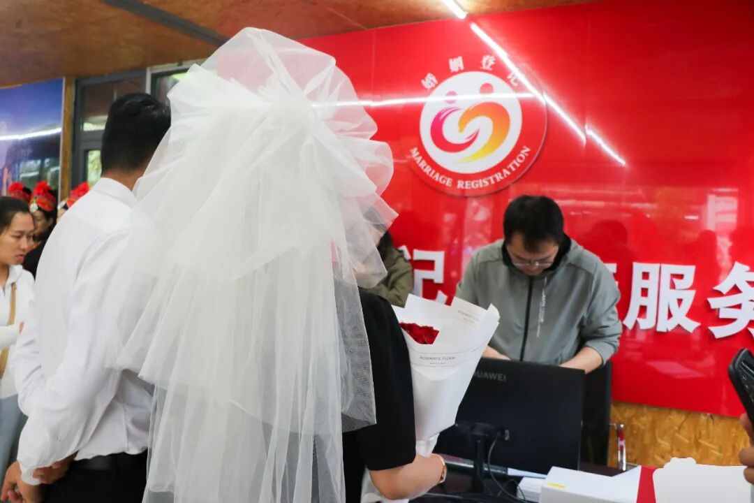 填表、签字、按手印……揭牌仪式结束没一会儿,两位新人已经完成了婚姻登记。石门关结婚登记点接待的第一对新人说:“很兴奋也很开心,从一开始我就想给我的女朋友一场浪漫的婚礼和一次与众不同的新婚体验。在景区里面办理登记结婚,真的是满足了我们的所有想象。我和我爱人都很开心,在景区领取结婚证书,很有纪念意义。”