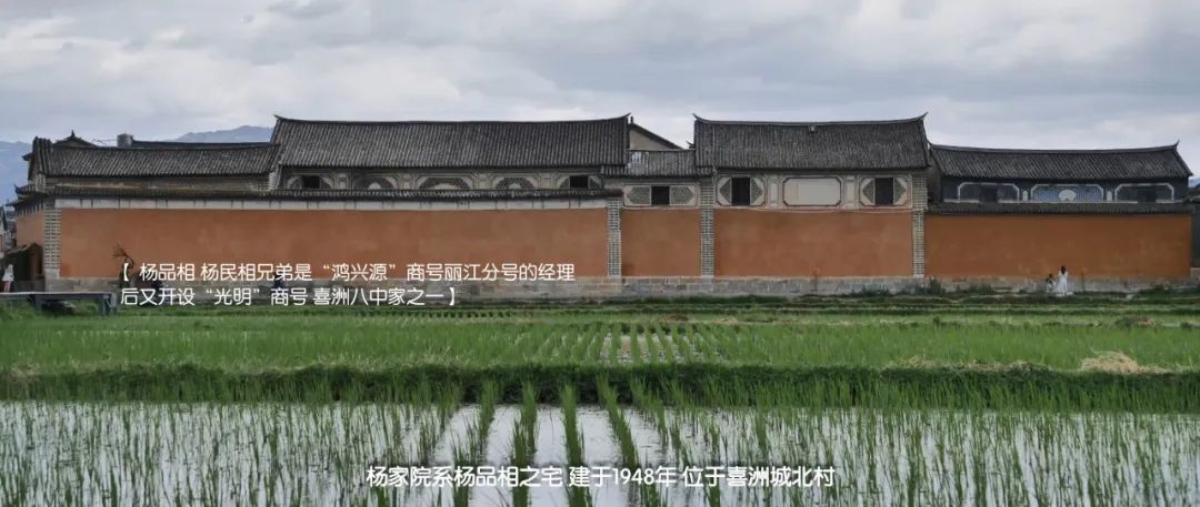 杨家院系杨品相之宅,建于1948年,位于喜洲城北村。杨品相、杨民相兄弟是“鸿兴源”商号丽江分号的经理,后又开设“光明”商号,喜洲八中家之一。