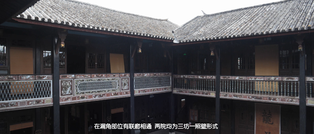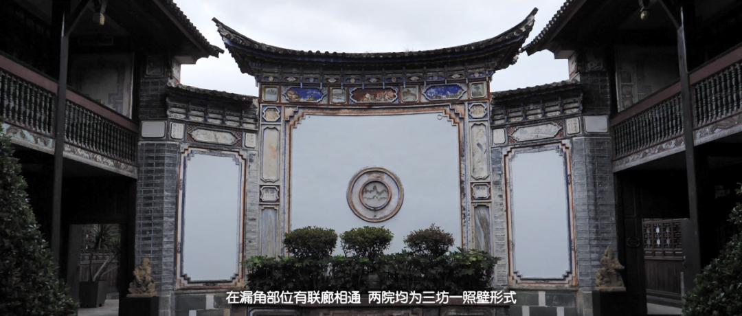 杨家院建筑为一进两院,“六合同春”的格局,带一个后院,系典型的民国中后期白族民居形式。宅院大门为砖石栱形结构,二门为有厦式,飞檐斗栱,雕饰精美、造型生动。主体为两层土木结构,一、二院二层吊厦回廊贯通,在漏角部位有联廊相通,两院均为三坊一照壁形式。内院尺度适中,装饰清丽,雕凿精细,门、窗、轩顶玲珑别致,透雕、彩画精巧细腻,是白族民间建筑工艺的凝聚。