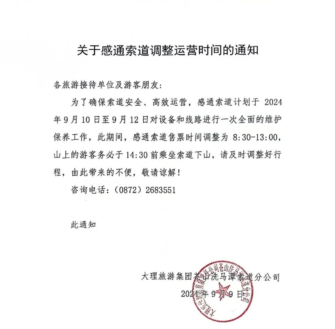 为了确保索道安全、高效运营,感通索道计划于2024年9月10日至9月12日对设备和线路进行一次全面的维护保养工作,此期间,感通索道售票时间调整为8:30—13:00,山上的游客务必于14:30 前乘坐索道下山,请及时调整好行程,由此带来的不便,敬请谅解!